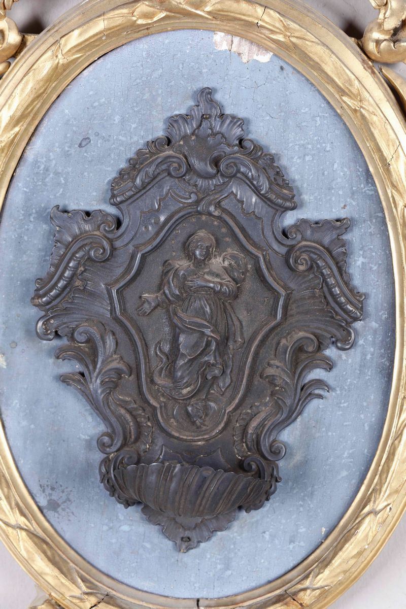 Acquasantiera in argento sbalzato e cesellato raffigurante Vergine Immacolata entro cornice ovale in legno intagliato e [..]