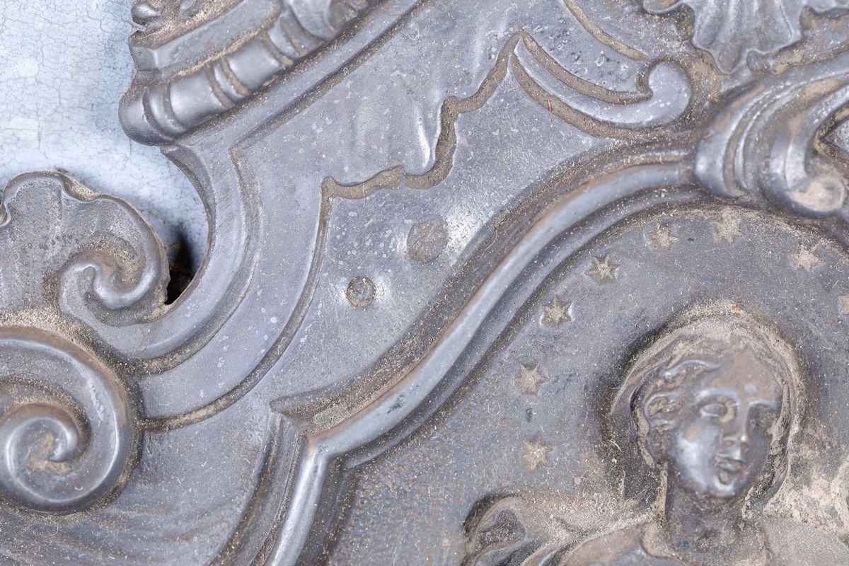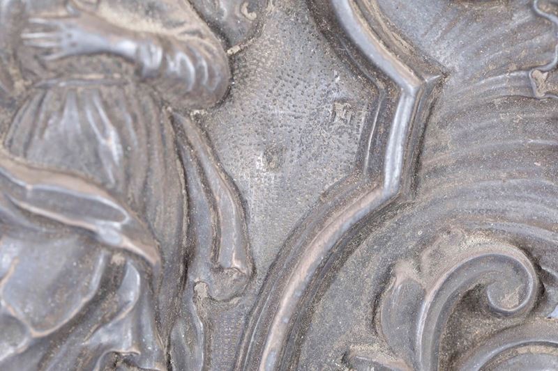 Acquasantiera in argento sbalzato e cesellato raffigurante Vergine Immacolata entro cornice ovale in legno intagliato e dorato. Genova fine XVIII secolo. Marchio della Torretta e di ricontrollo
