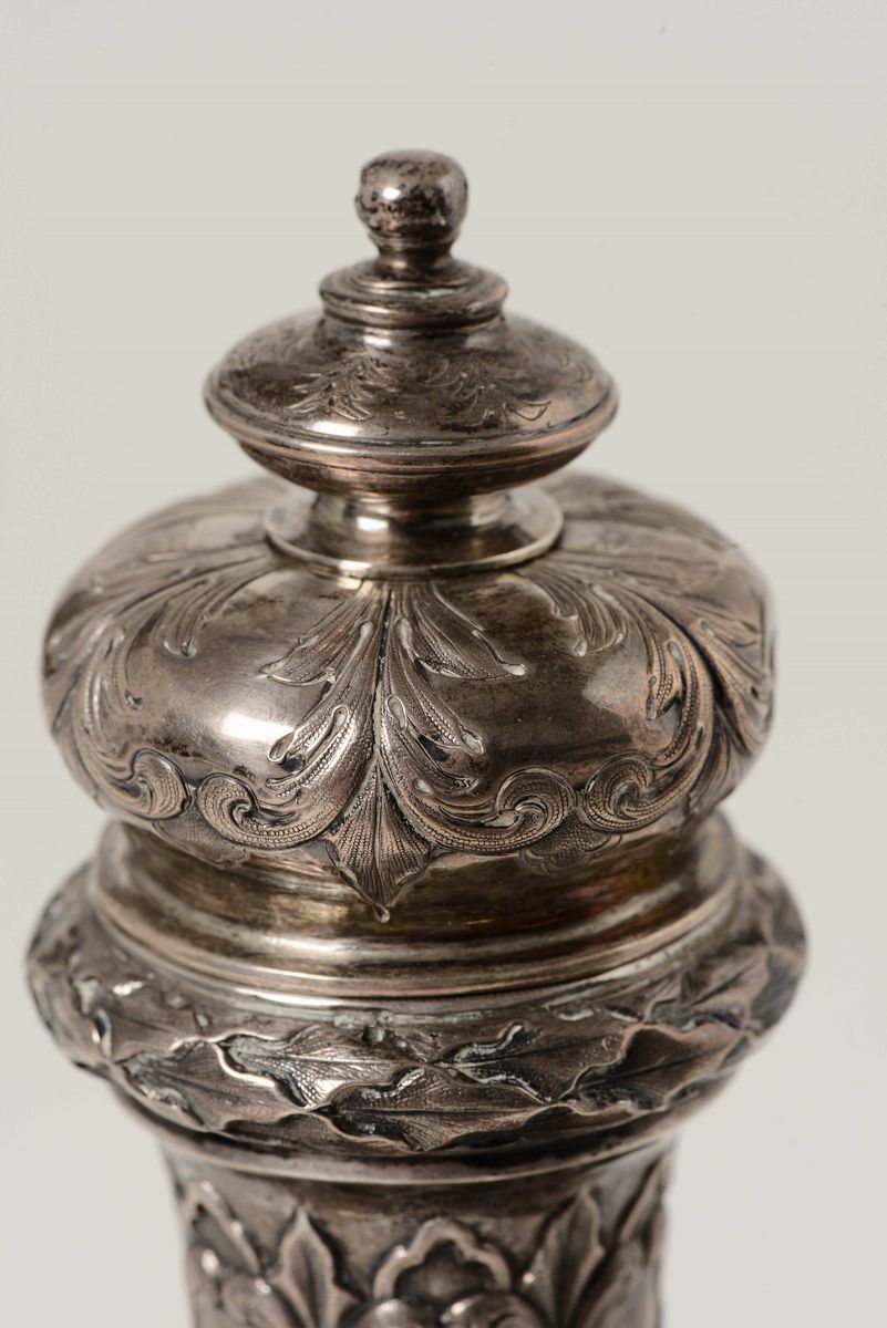 Bottiglia con tappo in argento sbalzato e inciso, Impero Britannico XIX secolo