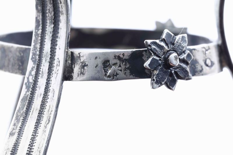 Coppia di saliere in argento fuso, sbalzato, cesellato e dorato. Bolli camerali e dell'argentiere consunti. Stato Pontificio (?) XIX secolo