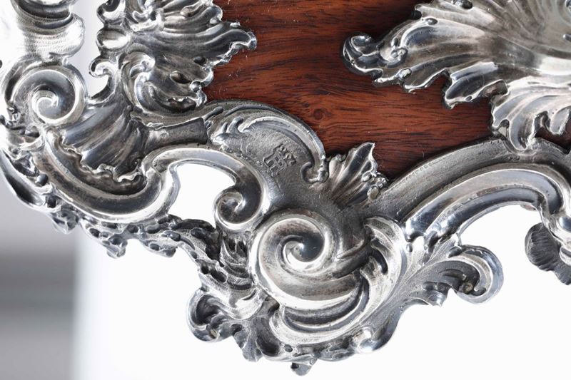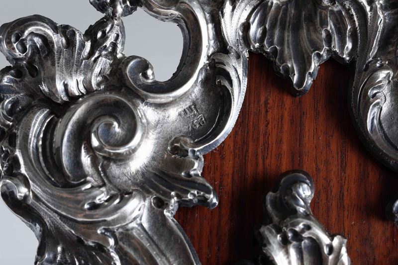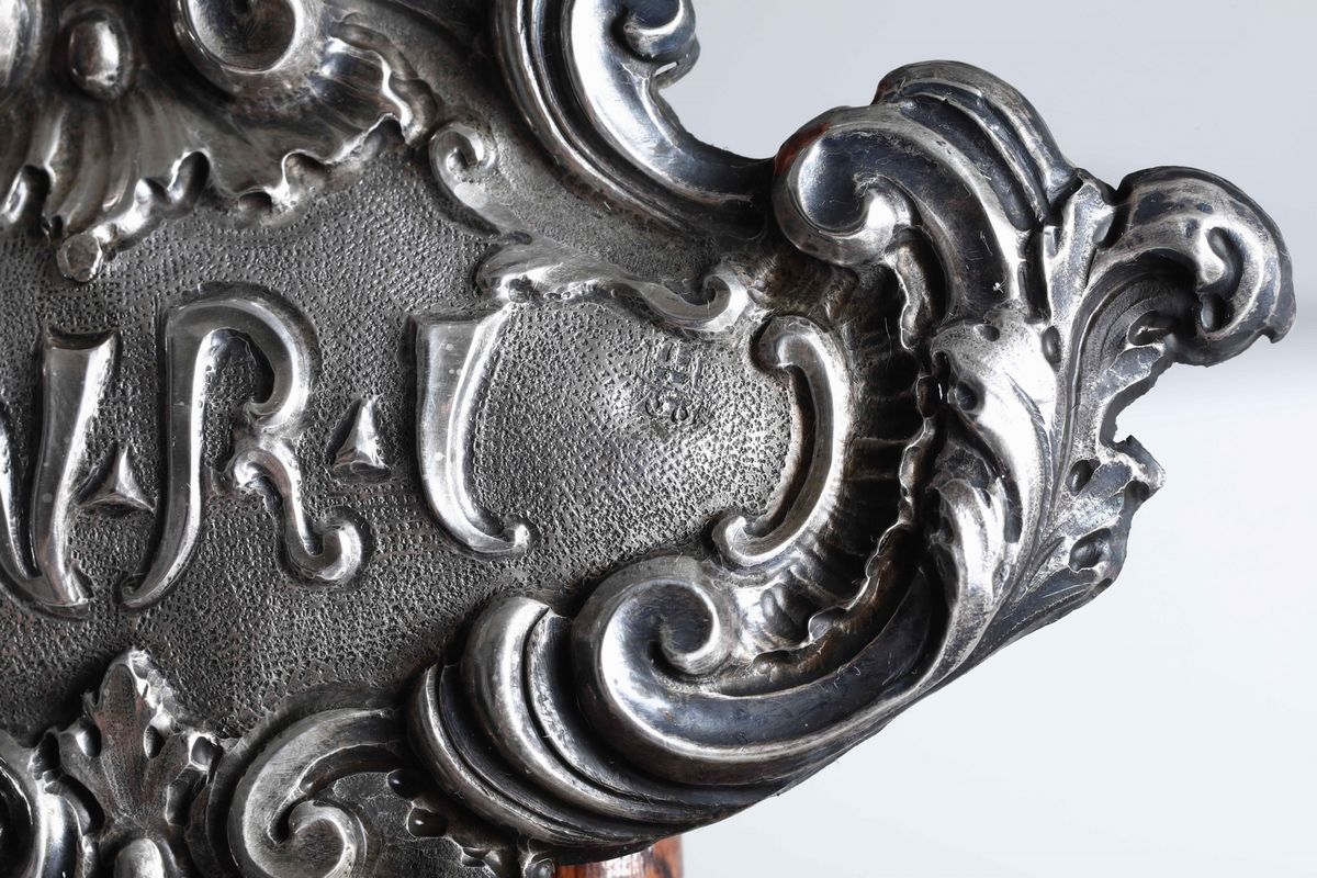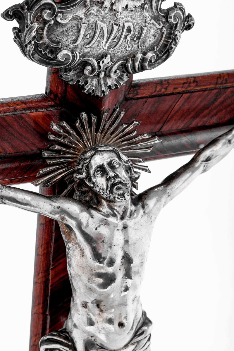 Crocifisso da tavolo in argento fuso, sbalzato e cesellato. Genova, marchio della torretta per l'anno 1753