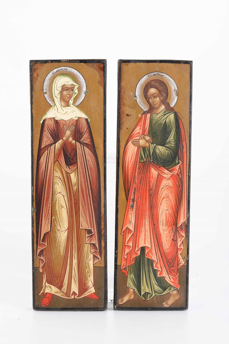 Due piccole icone con riza in metallo argentato raffiguranti Maria Maddalena e S.Giovanni. Russia XIX-XX secolo