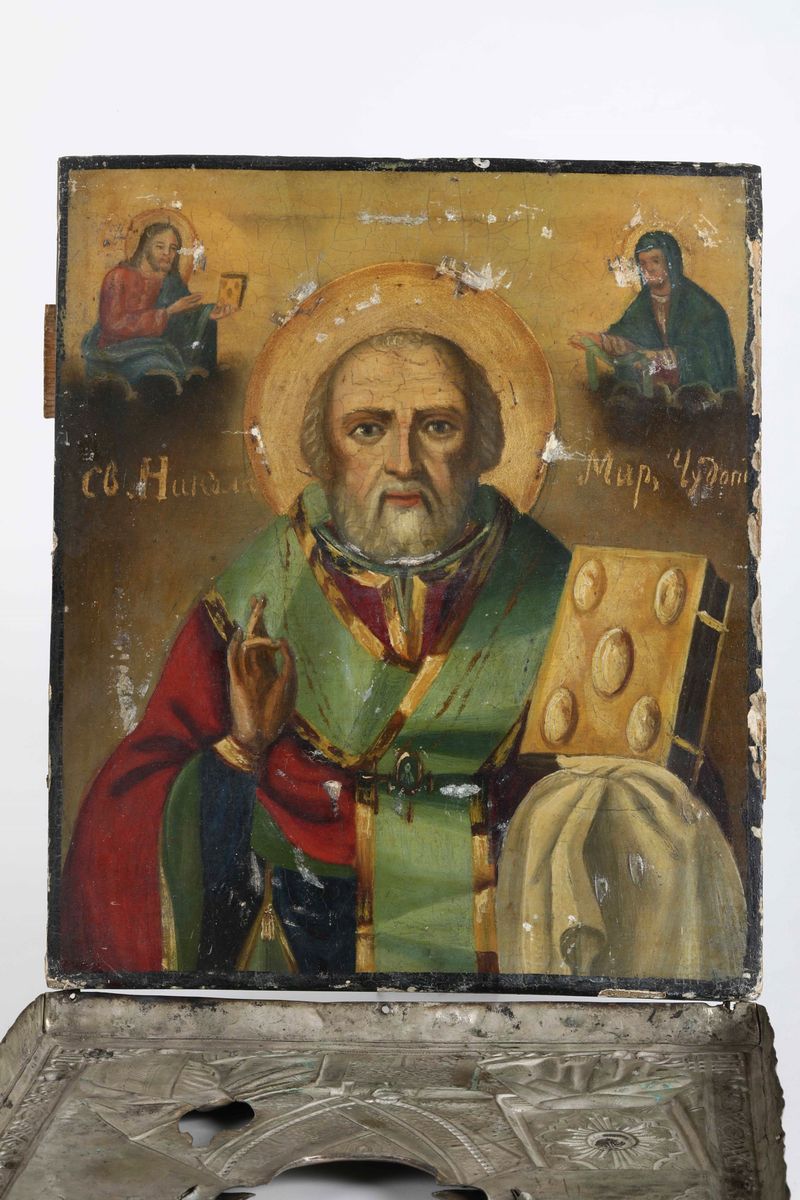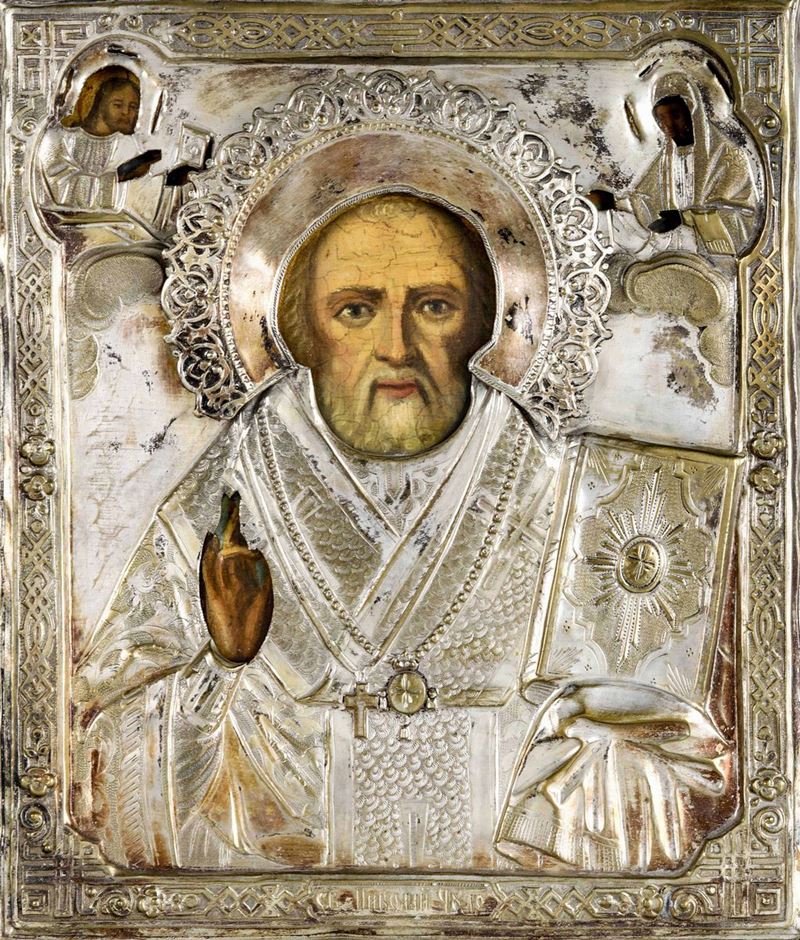 Icona con riza in argento sbalzato e cesellato raffigurante San Nicola. Russia XIX-XX secolo