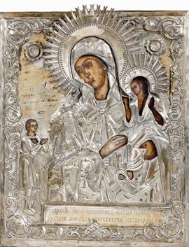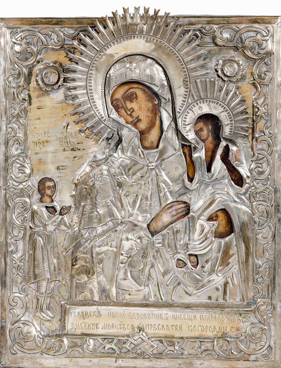 Icona con riza in metallo dorato raffigurante Vergine con Bambino. Russia XIX-XX secolo