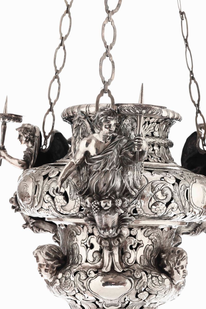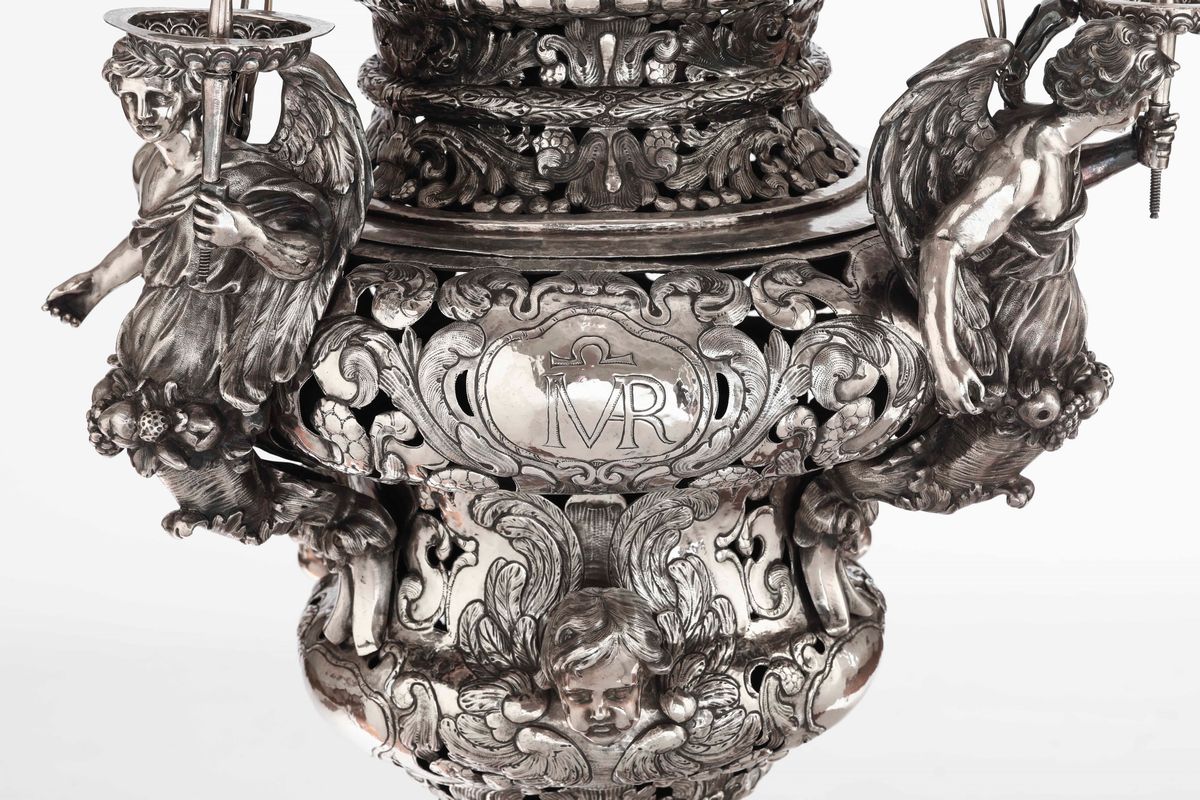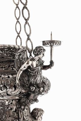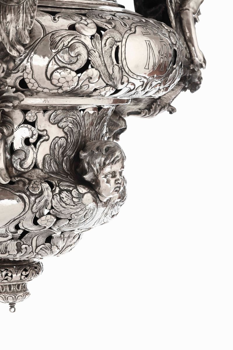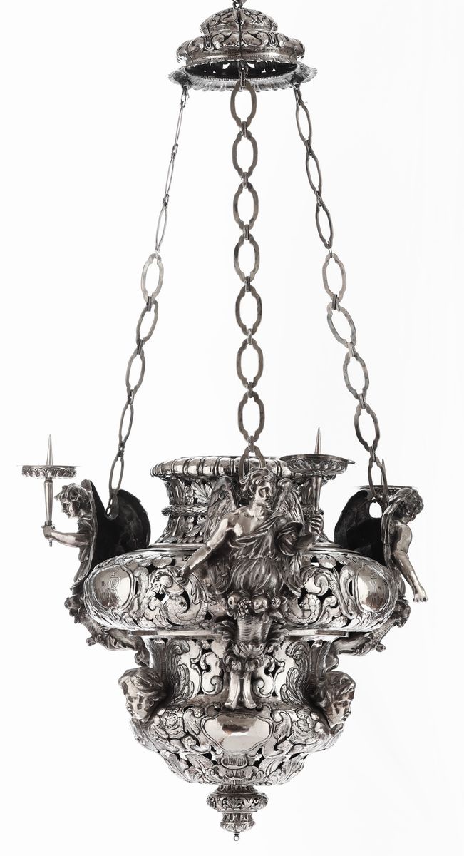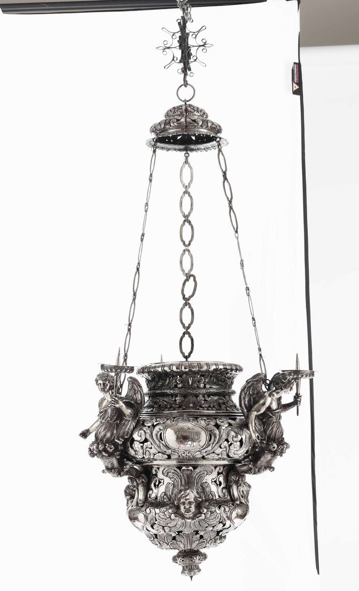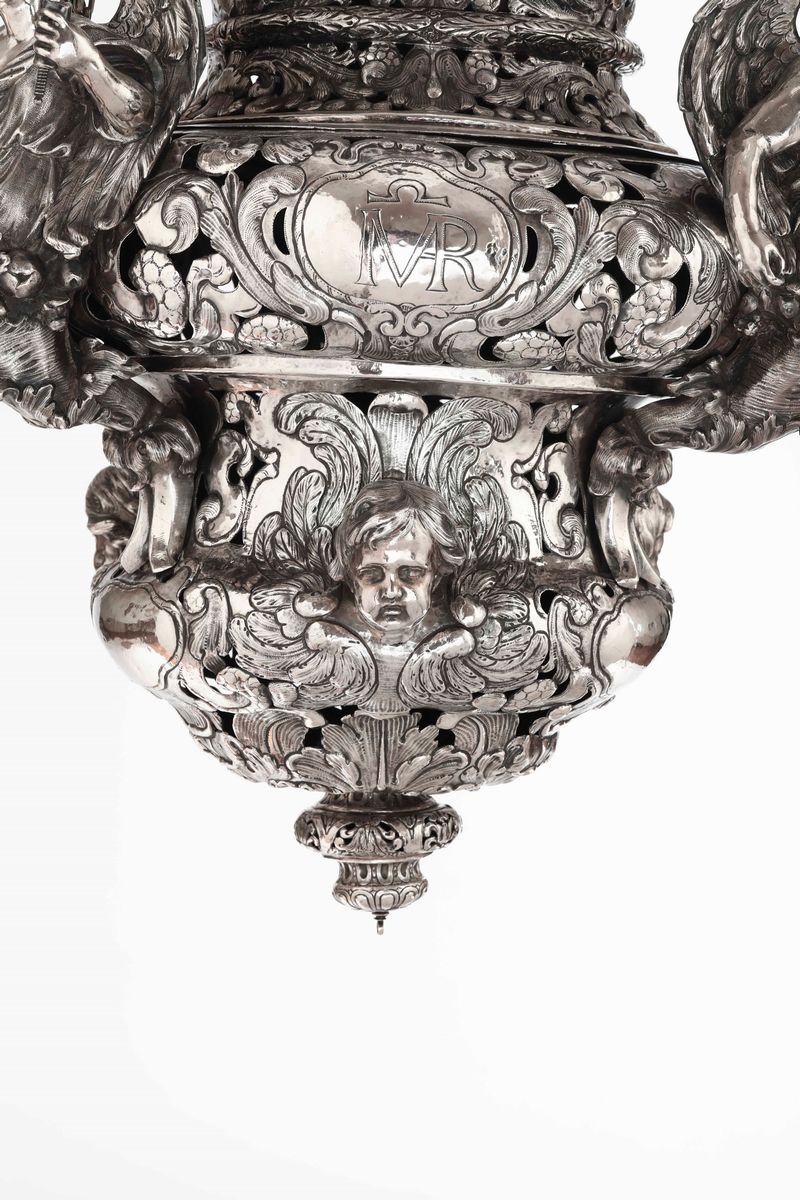 Monumentale lanterna in argento fuso, sbalzato e cesellato. Argentiere barocco operante nel XVIII secolo