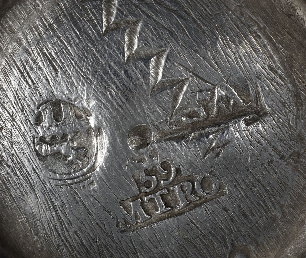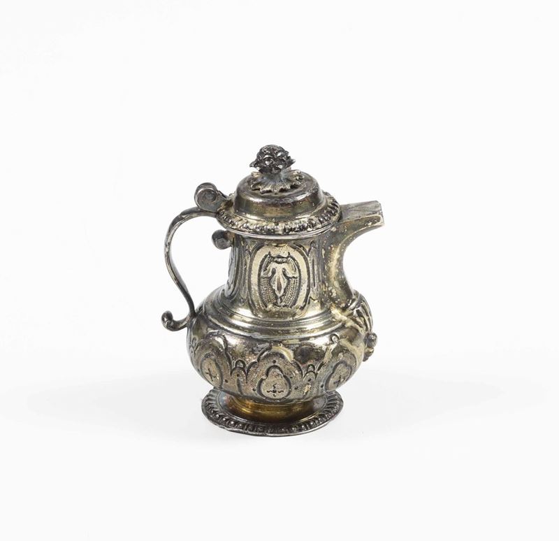 Piccolo versatoio in argento fuso, sbalzato, cesellato e dorato. Spagna (?), 1759