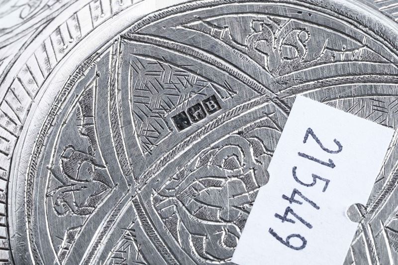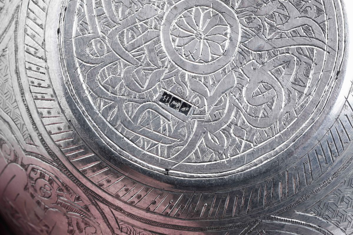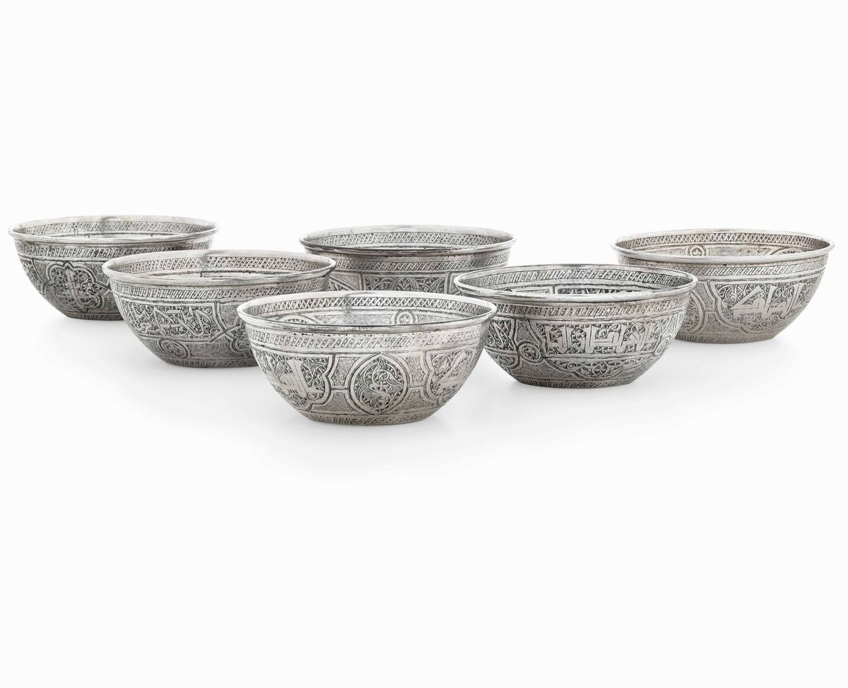 Sei ciotole semisferiche in argento 900 interamente incise a mano. Arte calligrafica Islamica, inizi XX secolo. Bolli di [..]