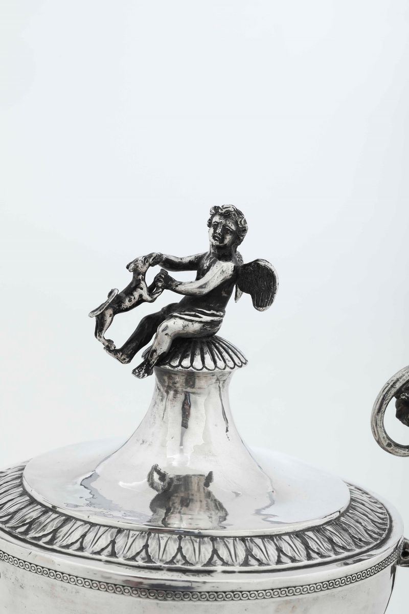 Eleganti decori neoclassici a foglie e palmette. Presa a foggia di amorino che gioca con cane