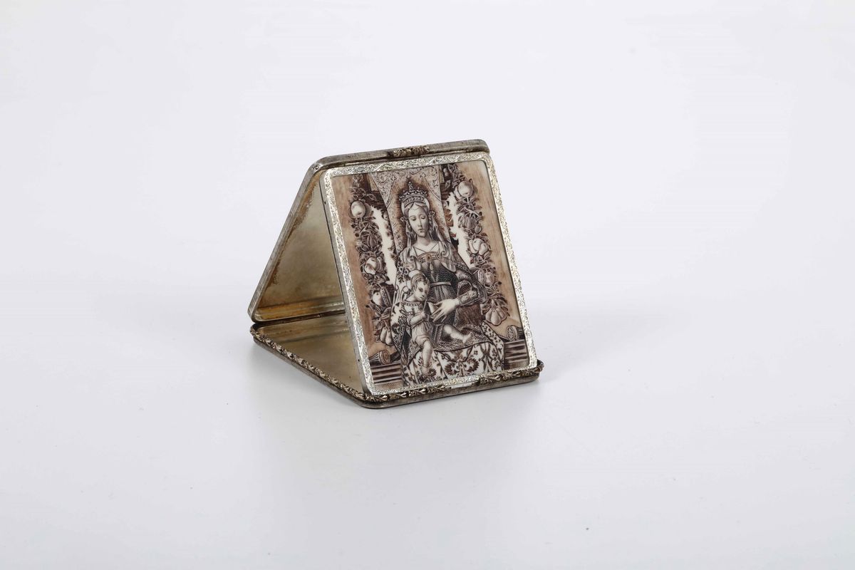 Il raffinato manufatto nato per la devozione personale è realizzato come prezioso scrigno che racchiude la raffigurazione della Madonna con Gesù in grembo magistralmente incisa derivata dalla celebre “Madonna della Candeletta” parte centrale del polittico su tavola eseguito dal pittore Carlo Crivelli (Venezia 1430 (?) - Ascoli Piceno 1495) poco prima della sua morte per il Duomo di Camerino e ora conservato presso la Pinacoteca di Brera a Milano.