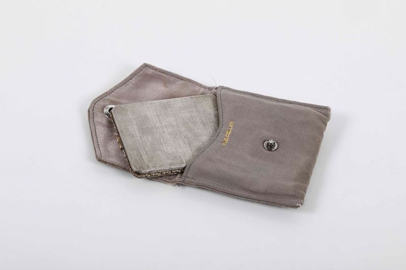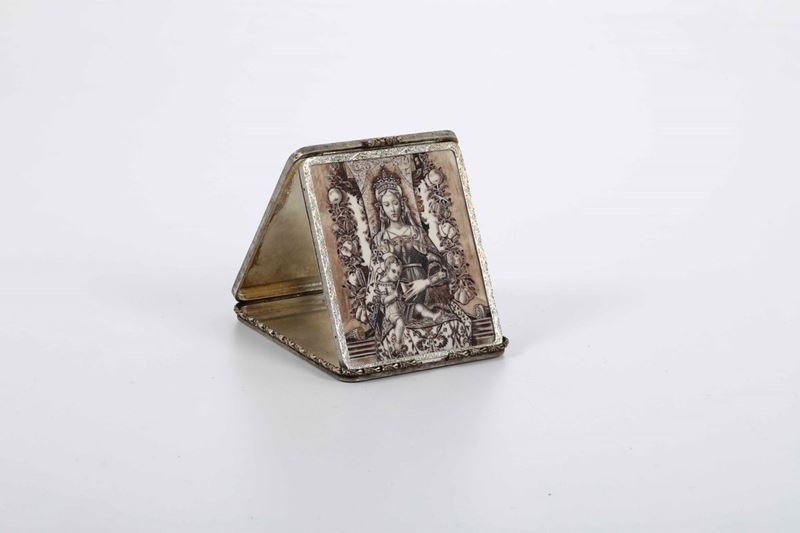 Altarolo devozionale portatile in argento, oro bianco e materiale naturale (dente di tricheco?). Custodia in stoffa. Maison [..]