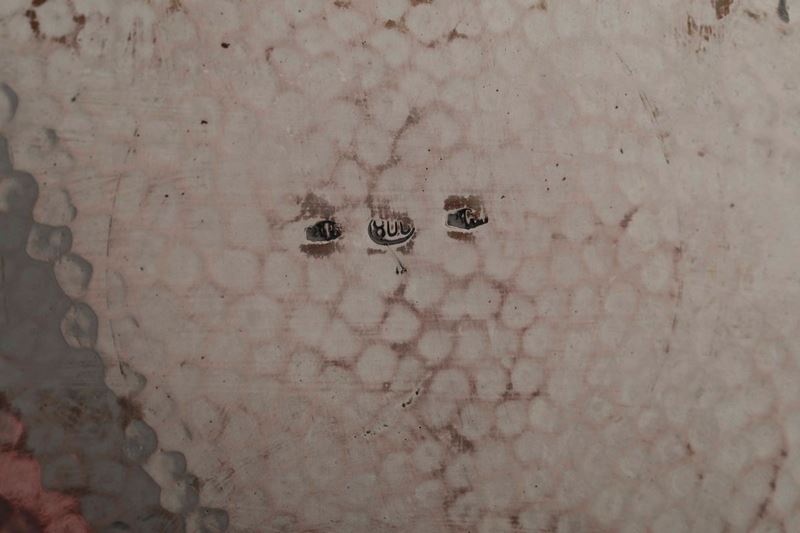 Due centrotavola in argento sbalzato e cesellato con decoro a melograni. Argenteria artistica italiana, uno recante marchio con fascio littorio in uso dal 1935 al 1945