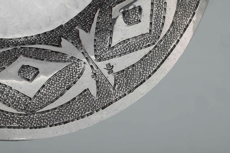 Insieme di quattro piattini in argento cesellato con motivi geometrici Art Deco. Colonie Italiane, Tripoli, Scuola orafi [..]