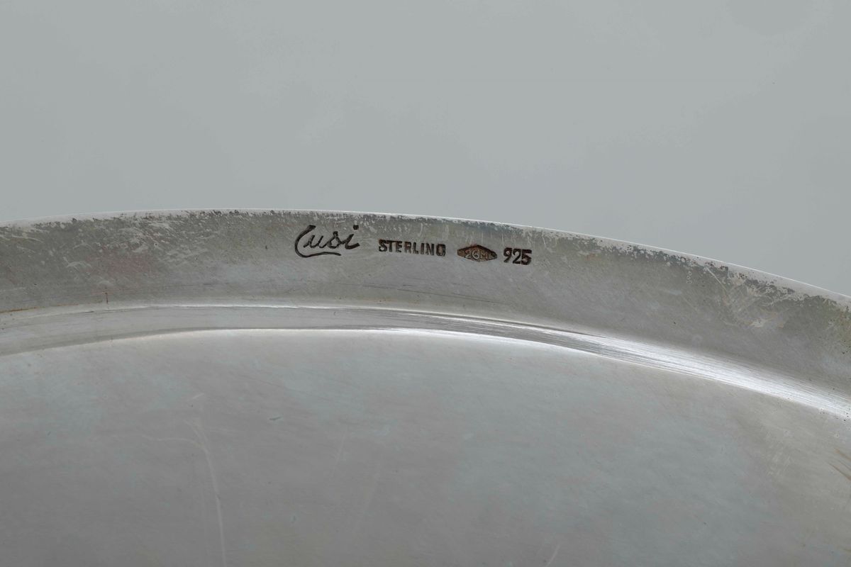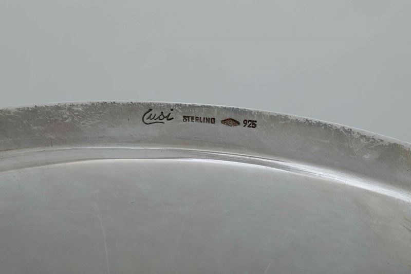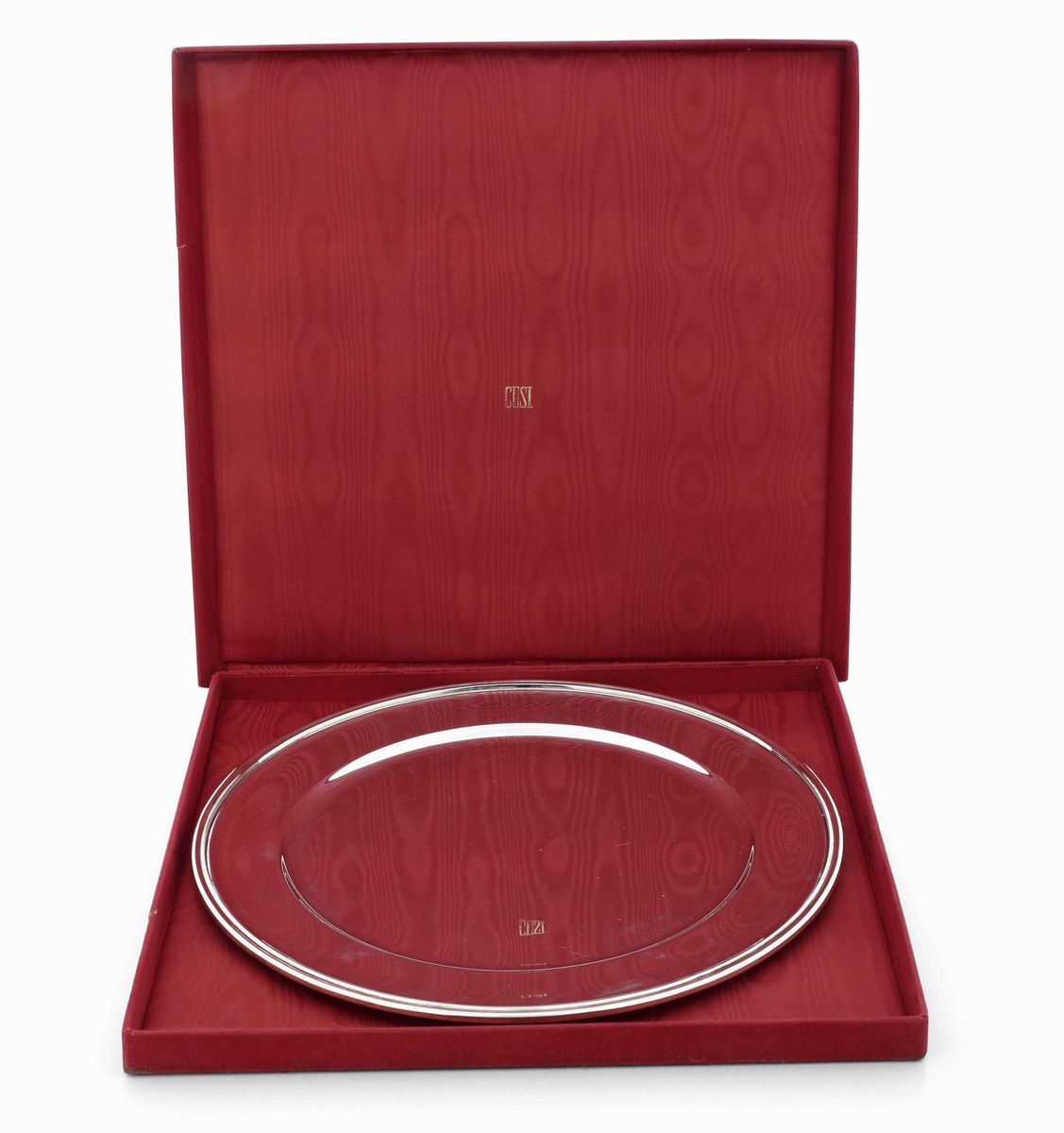 Piatto in argento sterling entro scatola. Gioielleria Cusi Milano. Argentiere Pradella, XX secolo