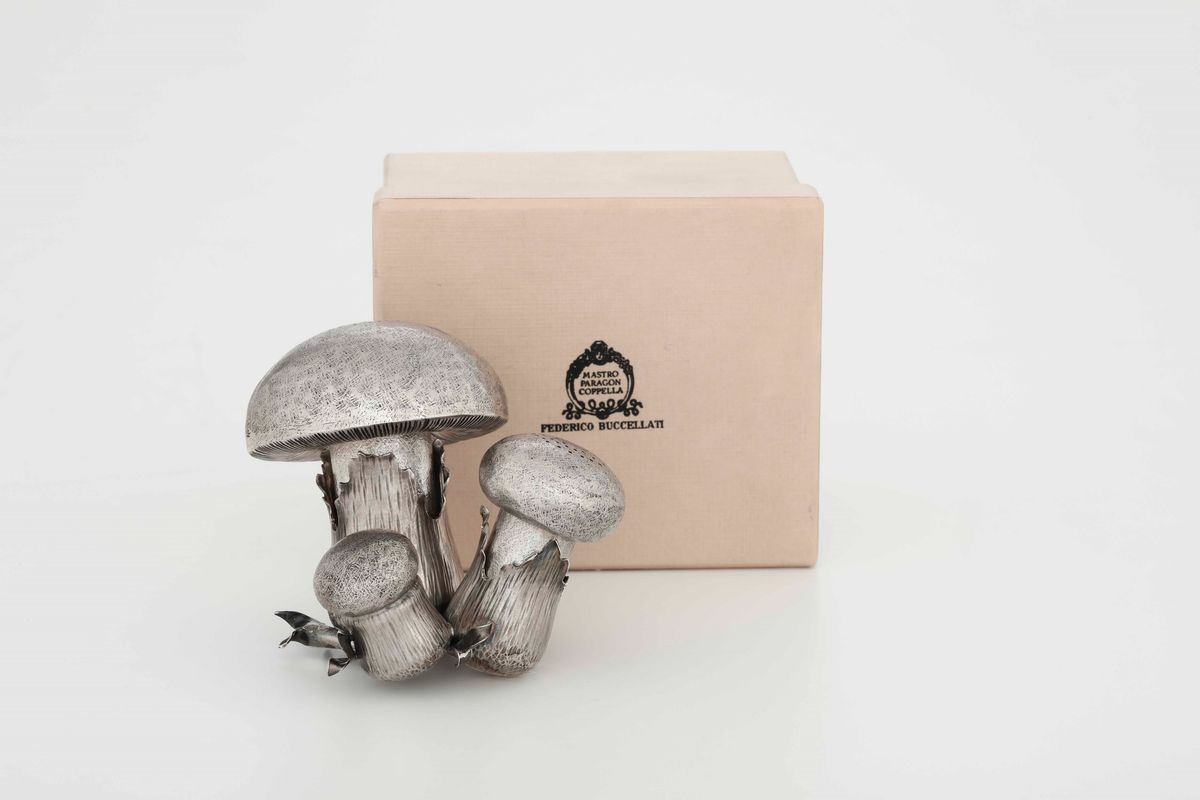 Porta sale e pepe in argento sterling a foggia di cespo di funghi. Argenteria artistica italiana del XX secolo. Maison Federico Buccellati