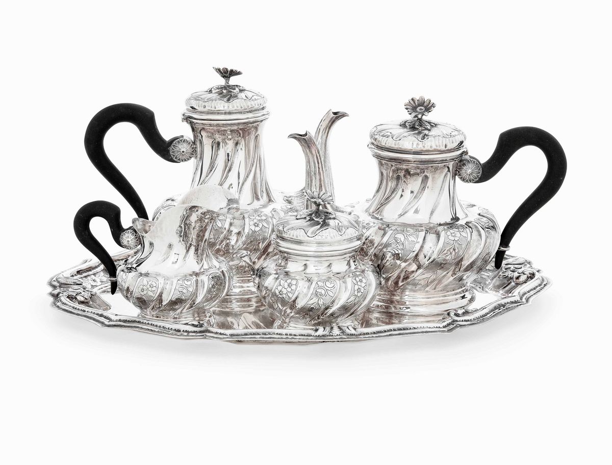 Servizio da tè e caffè in argento fuso e cesellato. Argenteria artistica italiana del XX secolo. Marchio con fascio littorio [..]