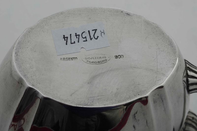 Servizio da tè e caffè tre pezzi in argento 900 di forma neoclassica. Bollo G. Confalonieri Gioielliere Milano Roma. Manifattura [..]