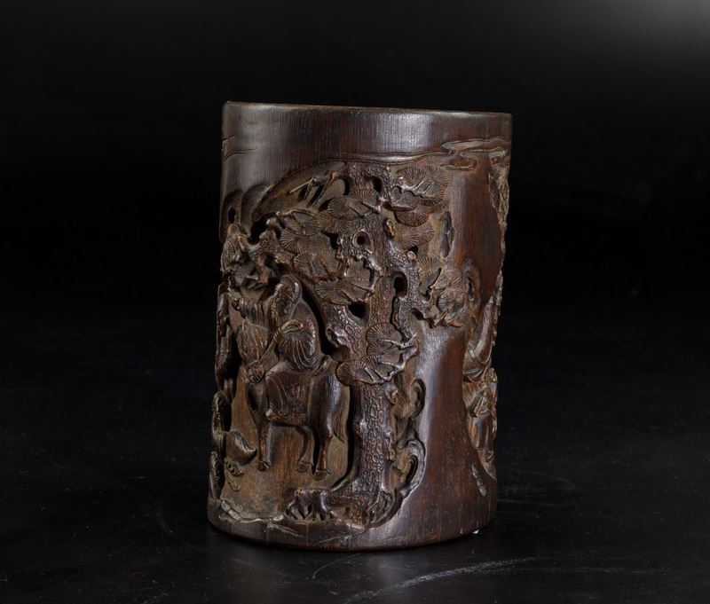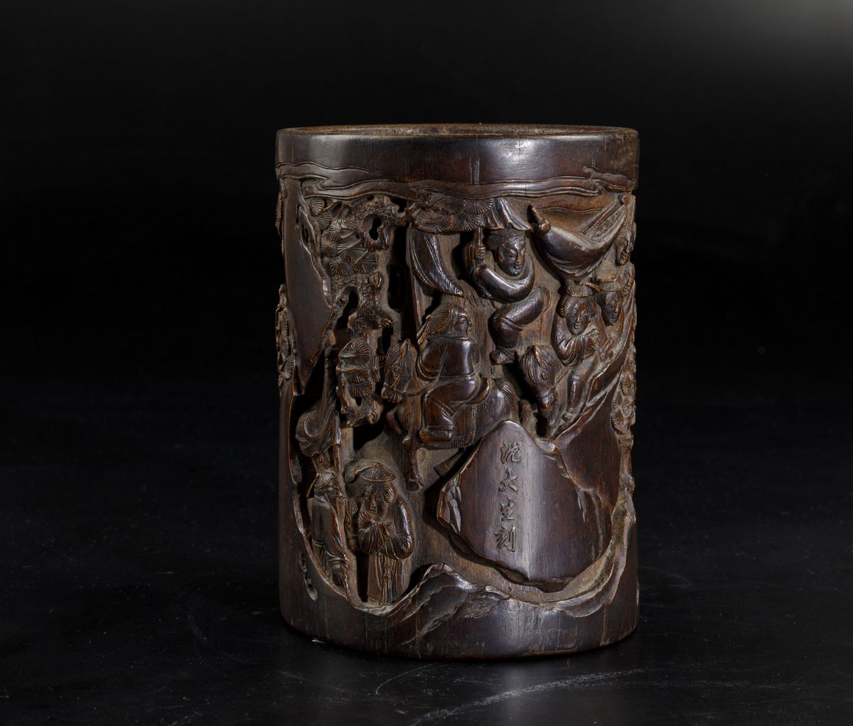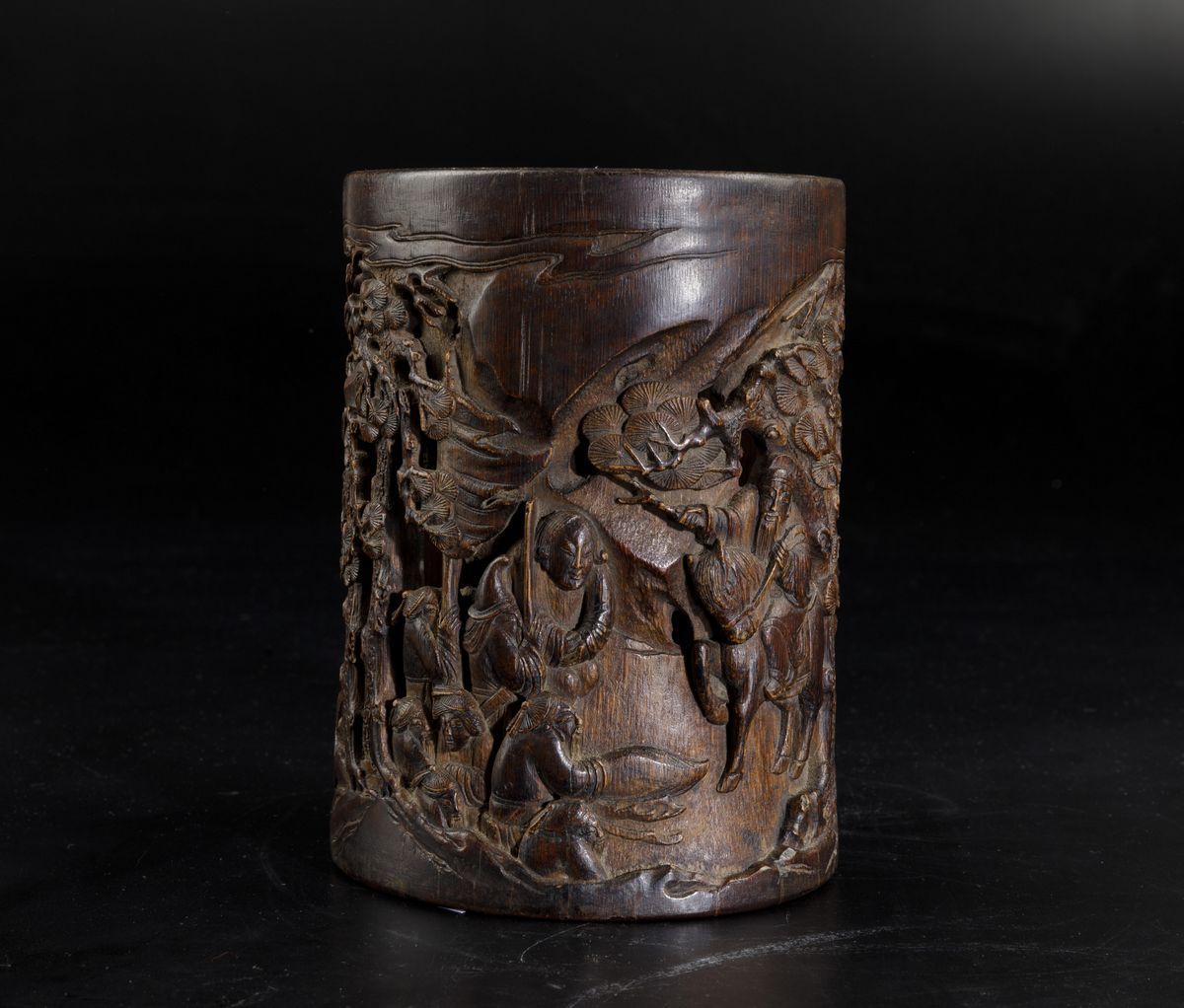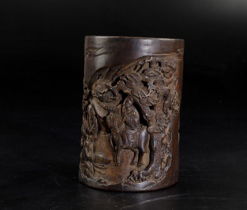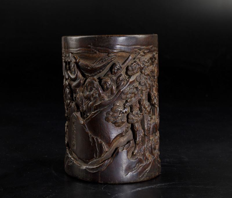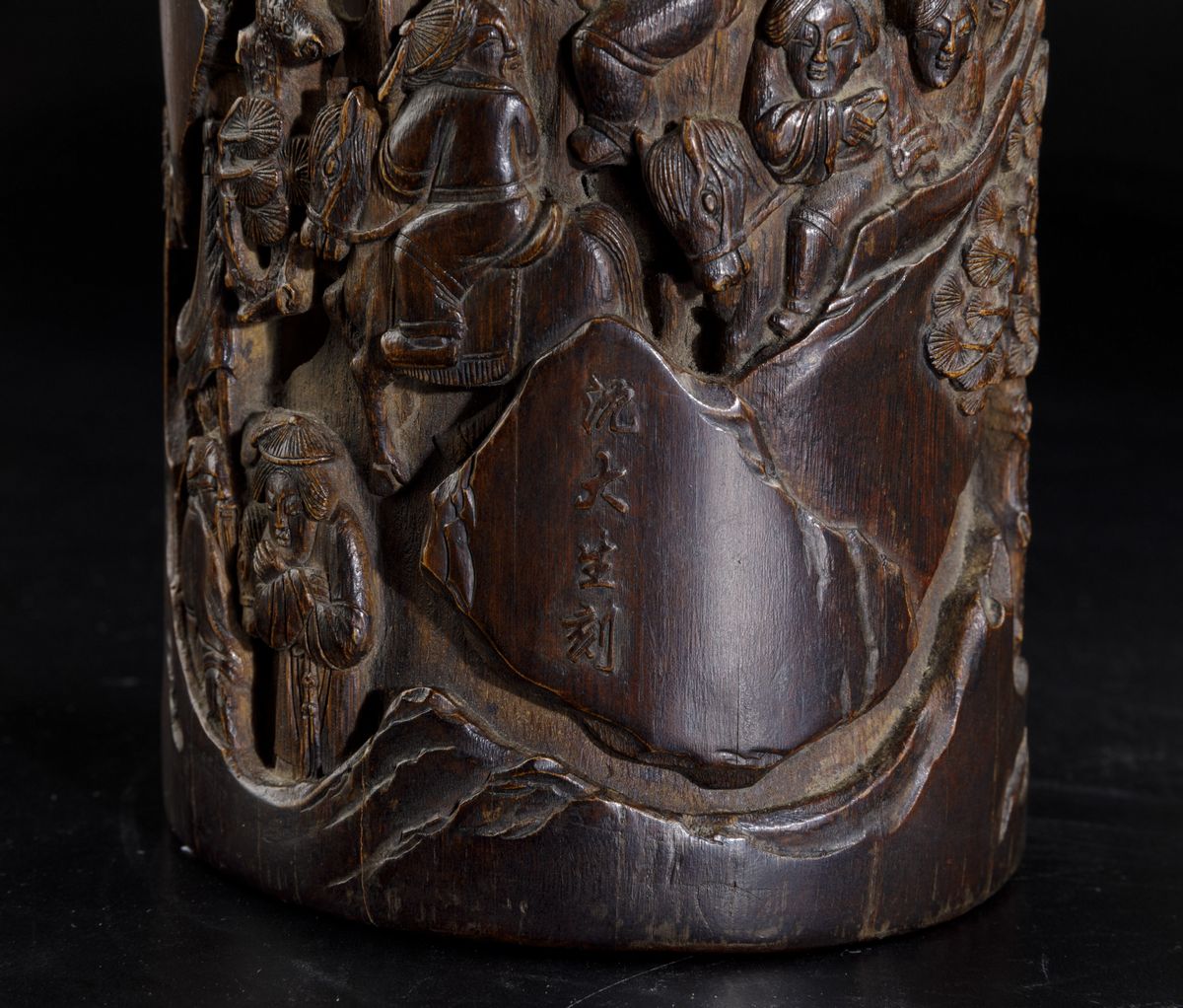 Brushpot in legno di bambù intagliato con paesaggio e figure, Cina, Dianstia Qing, XIX secolo