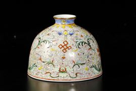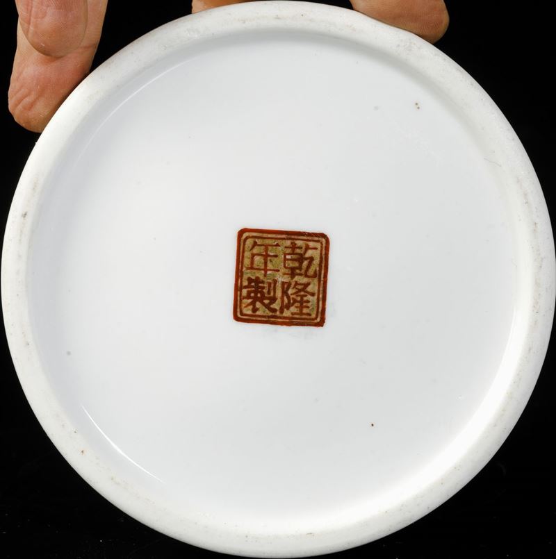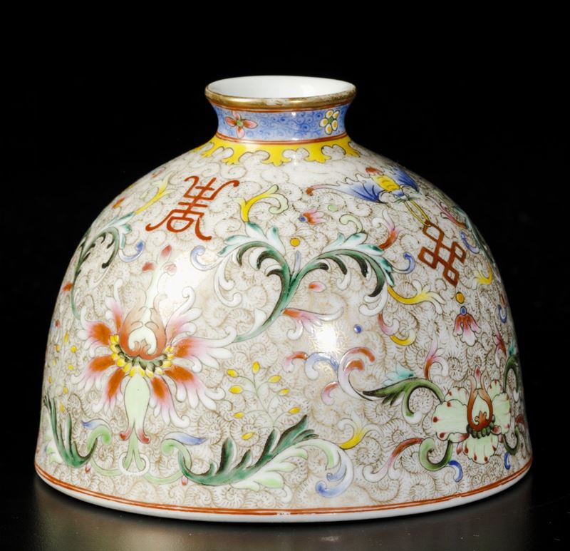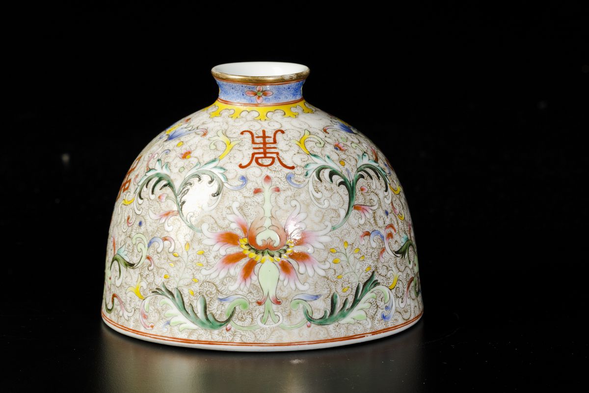 Calamaio Scolar in porcellana a smalti policromi con decoro di fiori di loto e simboli taoisti, Cina, XX secolo