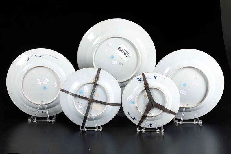 Cinque piatti diversi in porcellana bianca e blu con paesaggi, decori floreali e soggetti naturalistici, Cina, Dinastia Qing, epoca Kangxi 81662-1722) ed epoca Qianlong (1736-1796)