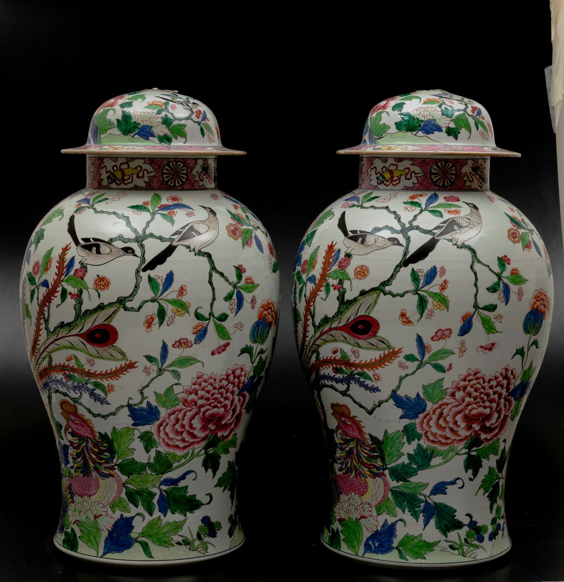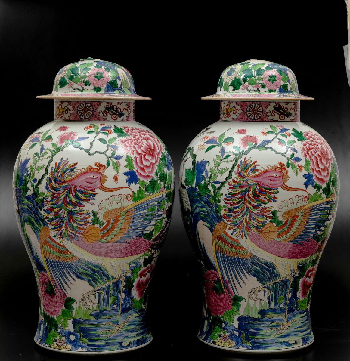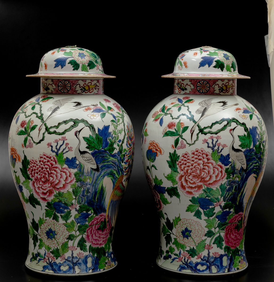 Coppia di grandi potiches in porcellana Samson con decori naturalistici con gru e fenici, Francia, XIX secolo