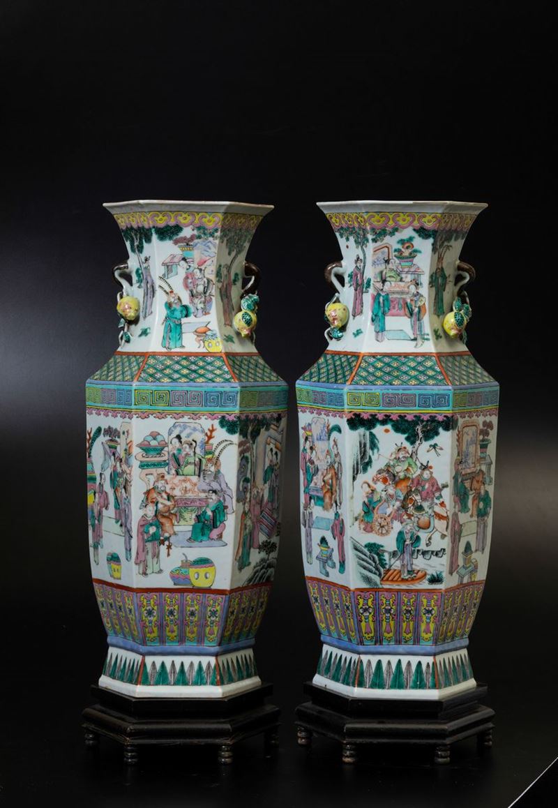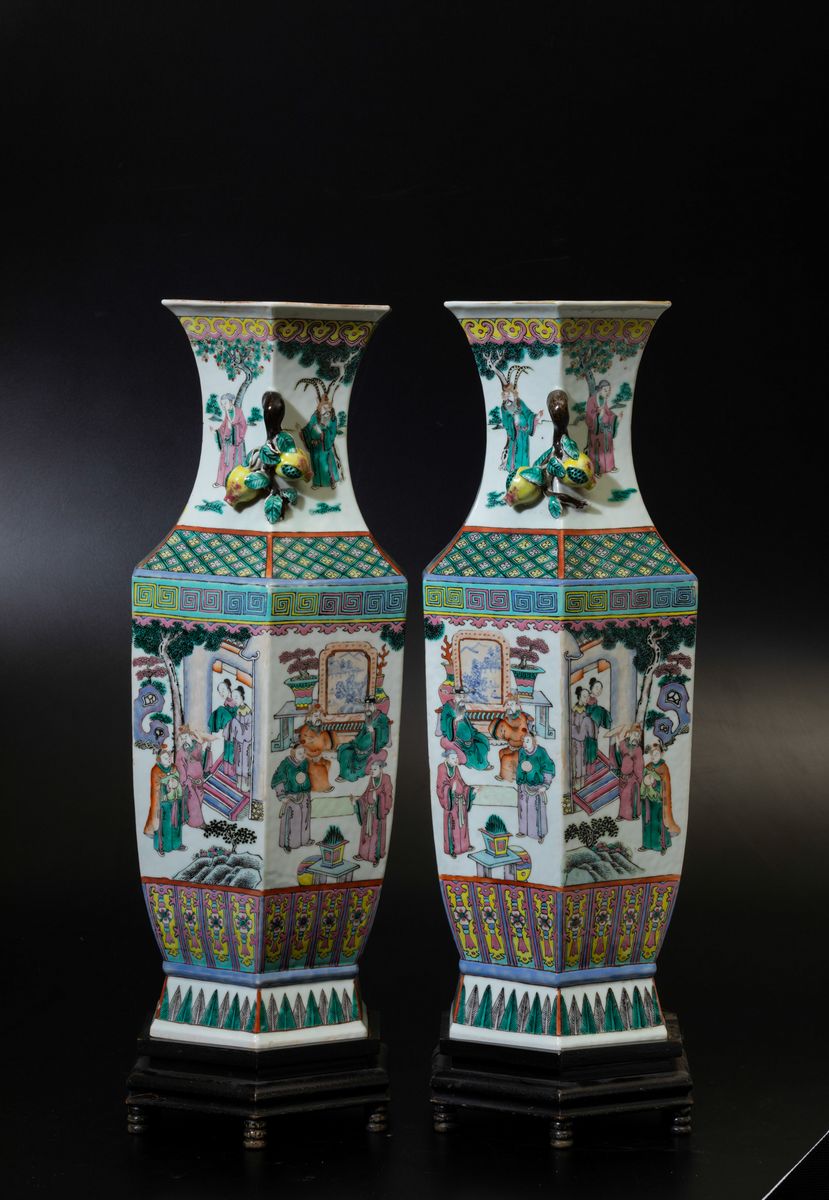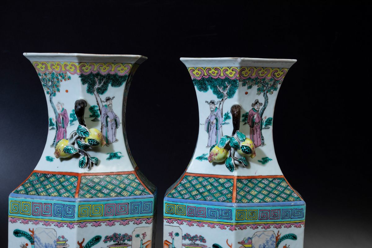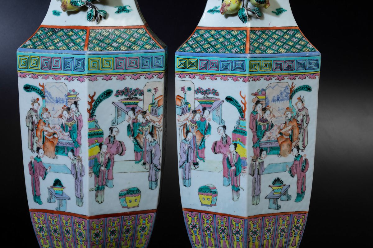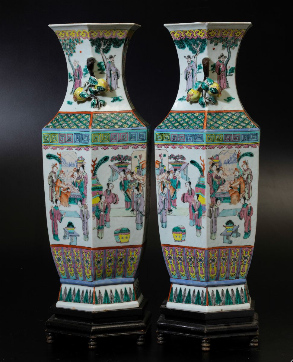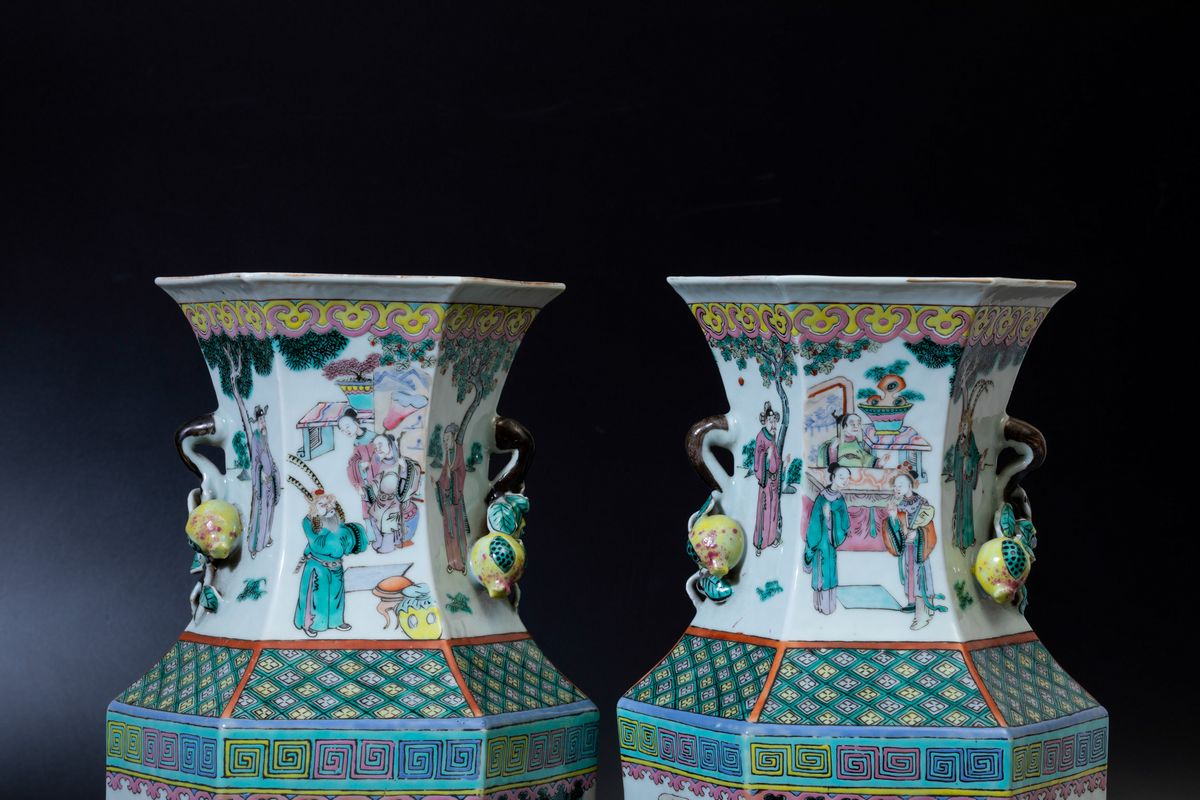 Coppia di vasi a balaustro a pianta esagonale in porcellana Famiglia Rosa con scene di vita comune e doppia ansa con elementi a rilievo a foggia di agrumi, Cina, Dinastia Qing, XIX secolo