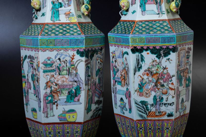 Coppia di vasi a balaustro a pianta esagonale in porcellana Famiglia Rosa con scene di vita comune e doppia ansa con elementi [..]
