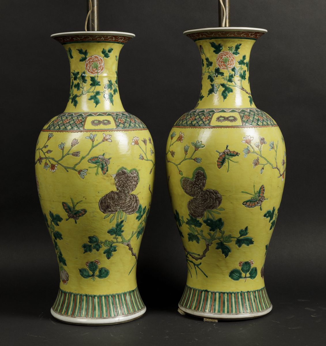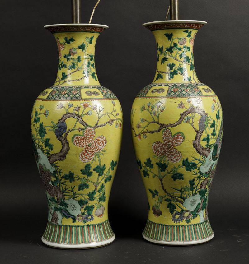 Coppia di vasi in porcellana Famiglia Verde a soggetto naturalistico su fondo giallo, Dinastia Qing,XIX secolo