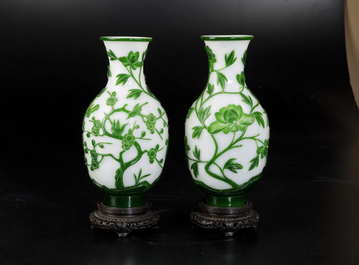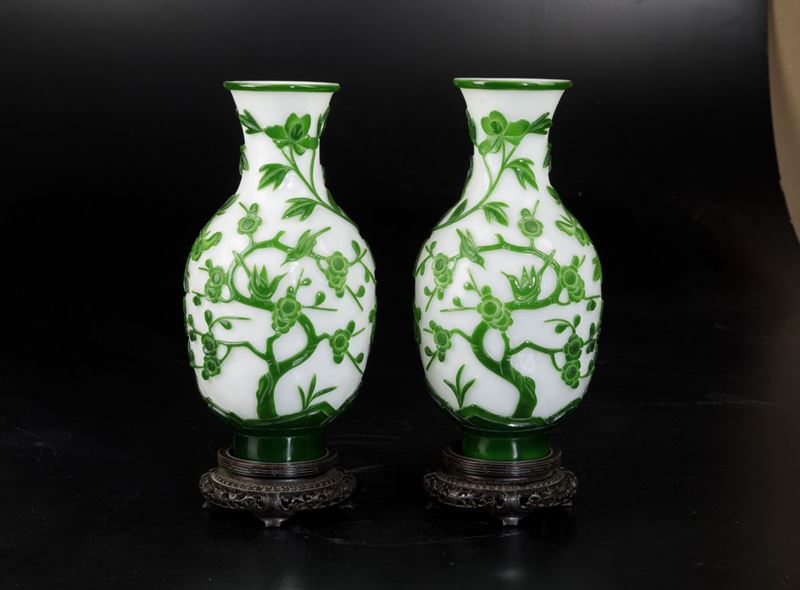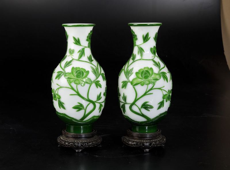 Coppia di vasi in vetro con decori floreali a cammeo sui toni del verde, Cina, XX secolo