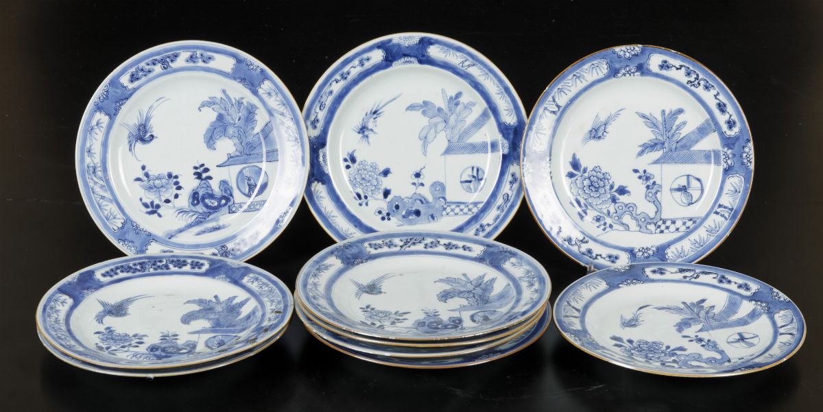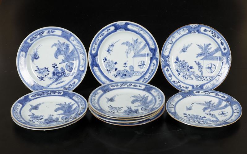 Dieci piatti in porcellana bianca e blu con paesaggi e decori floreali entro riserve, Cina, Dinastia Qing, epoca Qianlong (1736-1796)