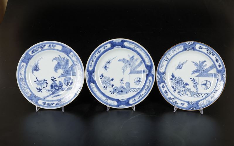 Dieci piatti in porcellana bianca e blu con paesaggi e decori floreali entro riserve, Cina, Dinastia Qing, epoca Qianlong [..]
