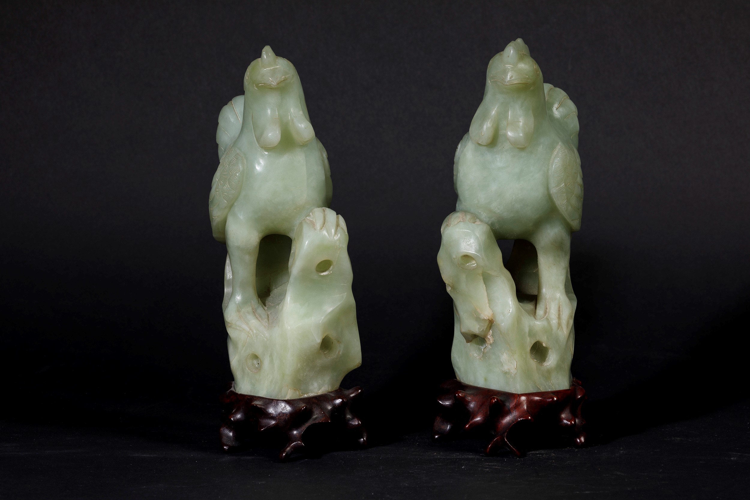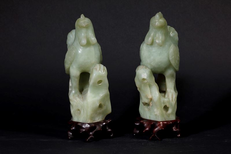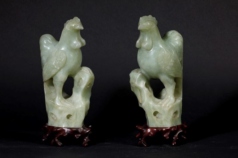 Due figure di galli scolpiti in giada Celadon, Cina, Dinastia Qing, fine XIX secolo