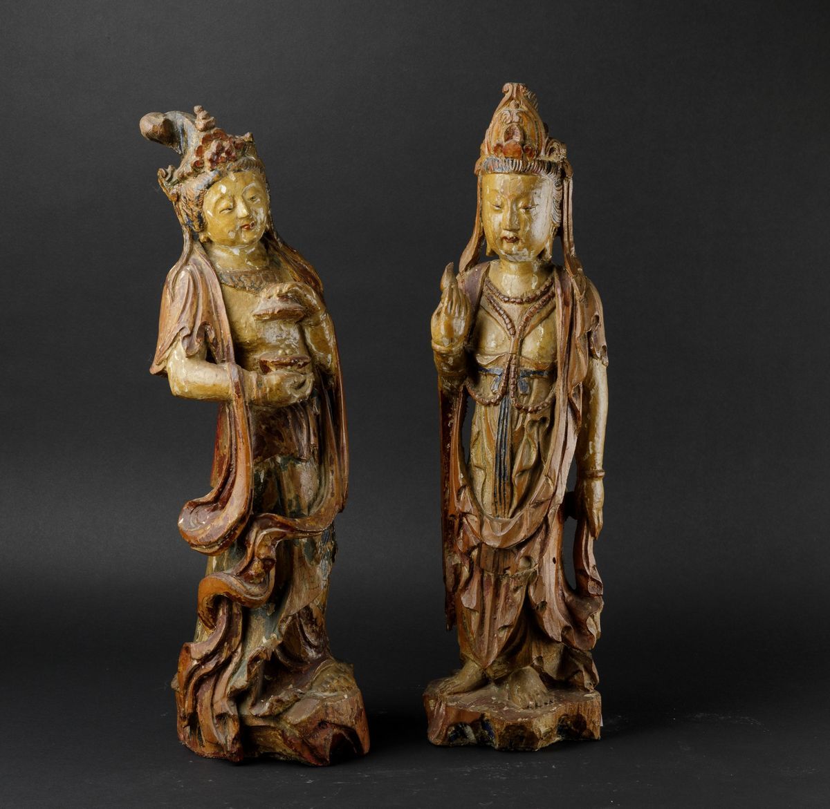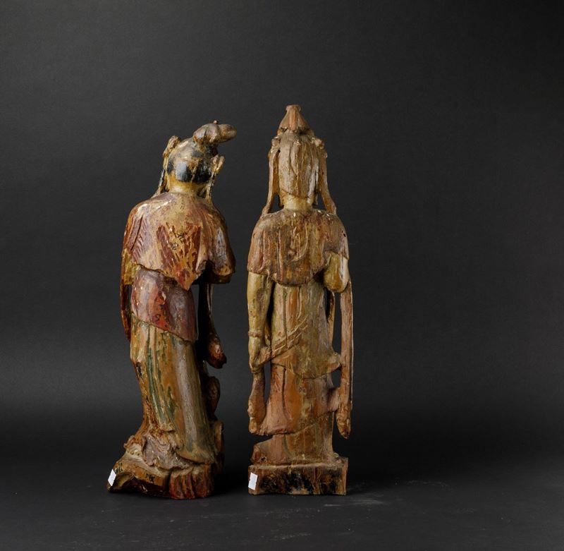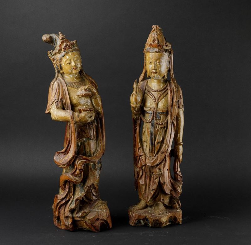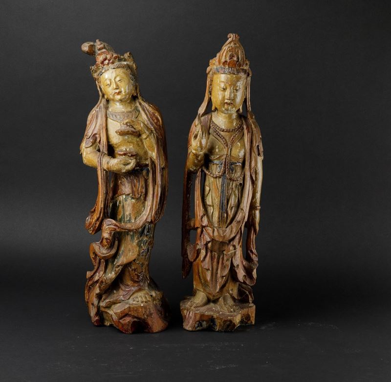 Due figure di Guanyin scolpite in legno con tracce di policromia, Cina, Dinastia Qing, XIX secolo