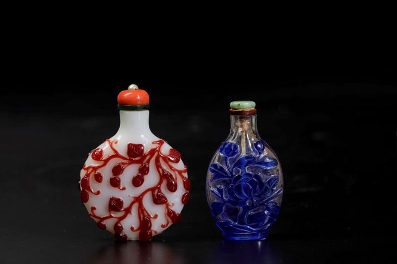 Due snuff bottles in vetro con decori vegetali a cammeo, Cina, Dinastia Qing, XIX secolo