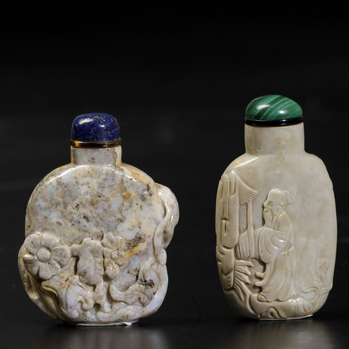 Due snuff bottles scolpite in opale con figure a rilievo di gatti e di saggio entro paesaggio, Cina, Dinastia Qing, XIX secolo