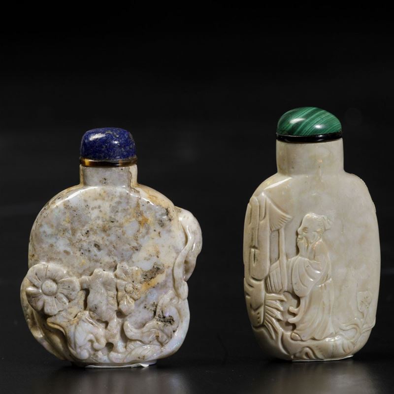 Due snuff bottles scolpite in opale con figure a rilievo di gatti e di saggio entro paesaggio, Cina, Dinastia Qing, XIX [..]