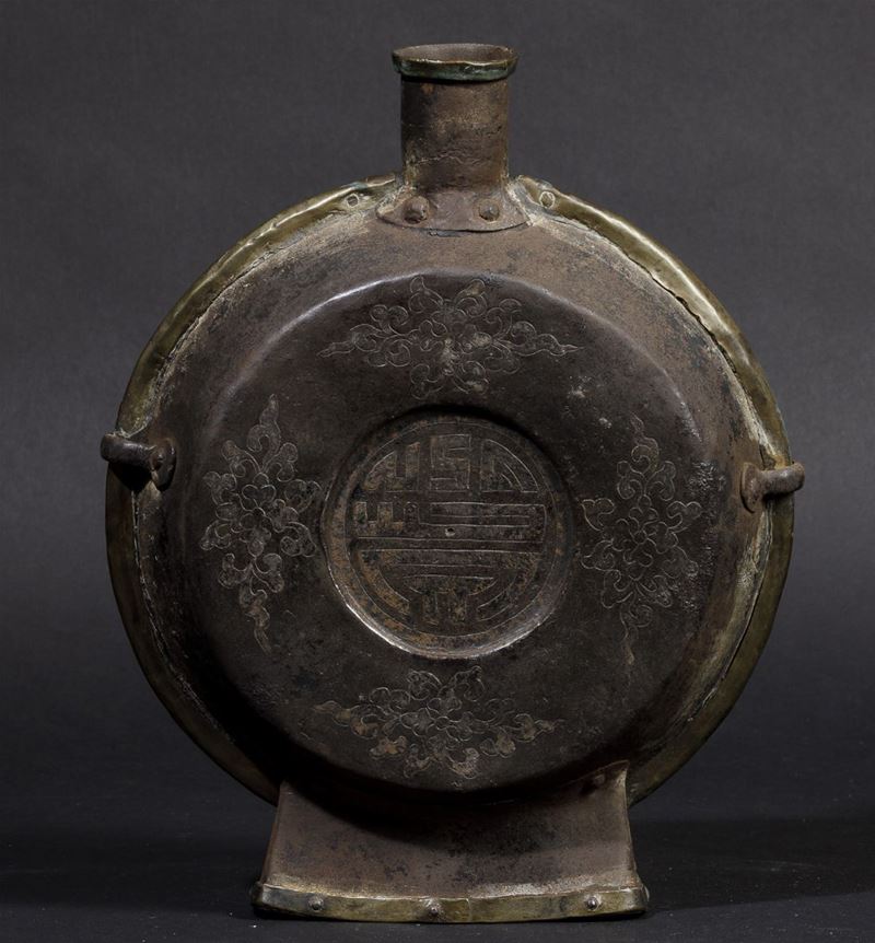 Fiasca in bronzo con simboli taoisti e decori floreali incisi, Cina, Dinastia Qing, XVIII secolo