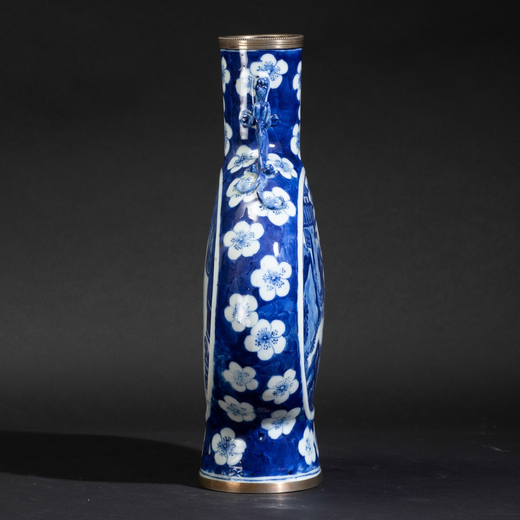 Fiasca in porcellana bianca e blu con anse a foggia di draghetto, scene di vita comune entro riserve e decori floreali, Cina, Dinastia Qing, XIX secolo