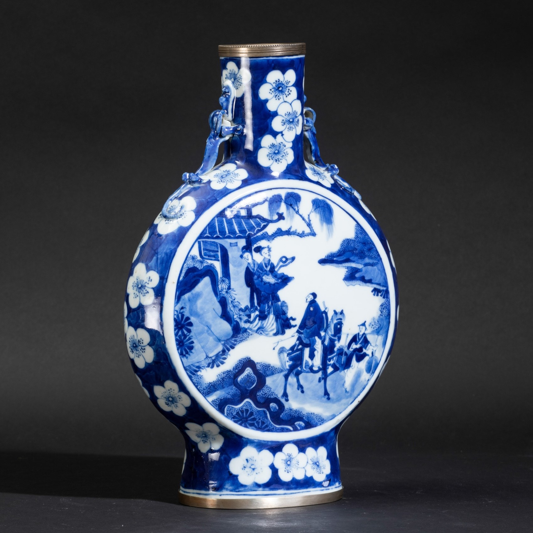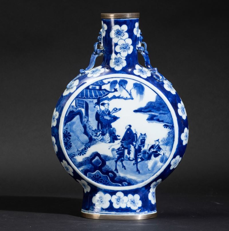 Fiasca in porcellana bianca e blu con anse a foggia di draghetto, scene di vita comune entro riserve e decori floreali, [..]