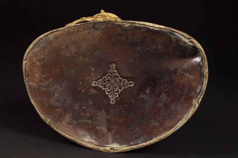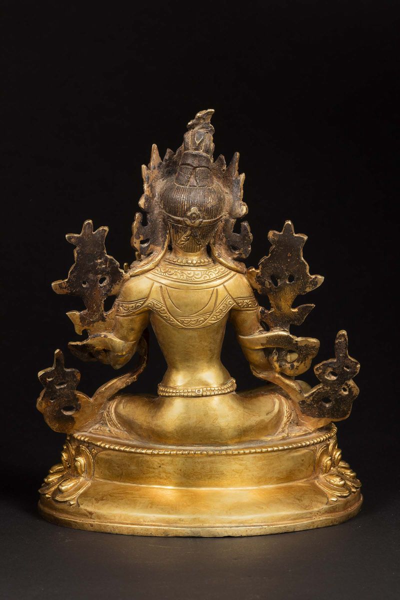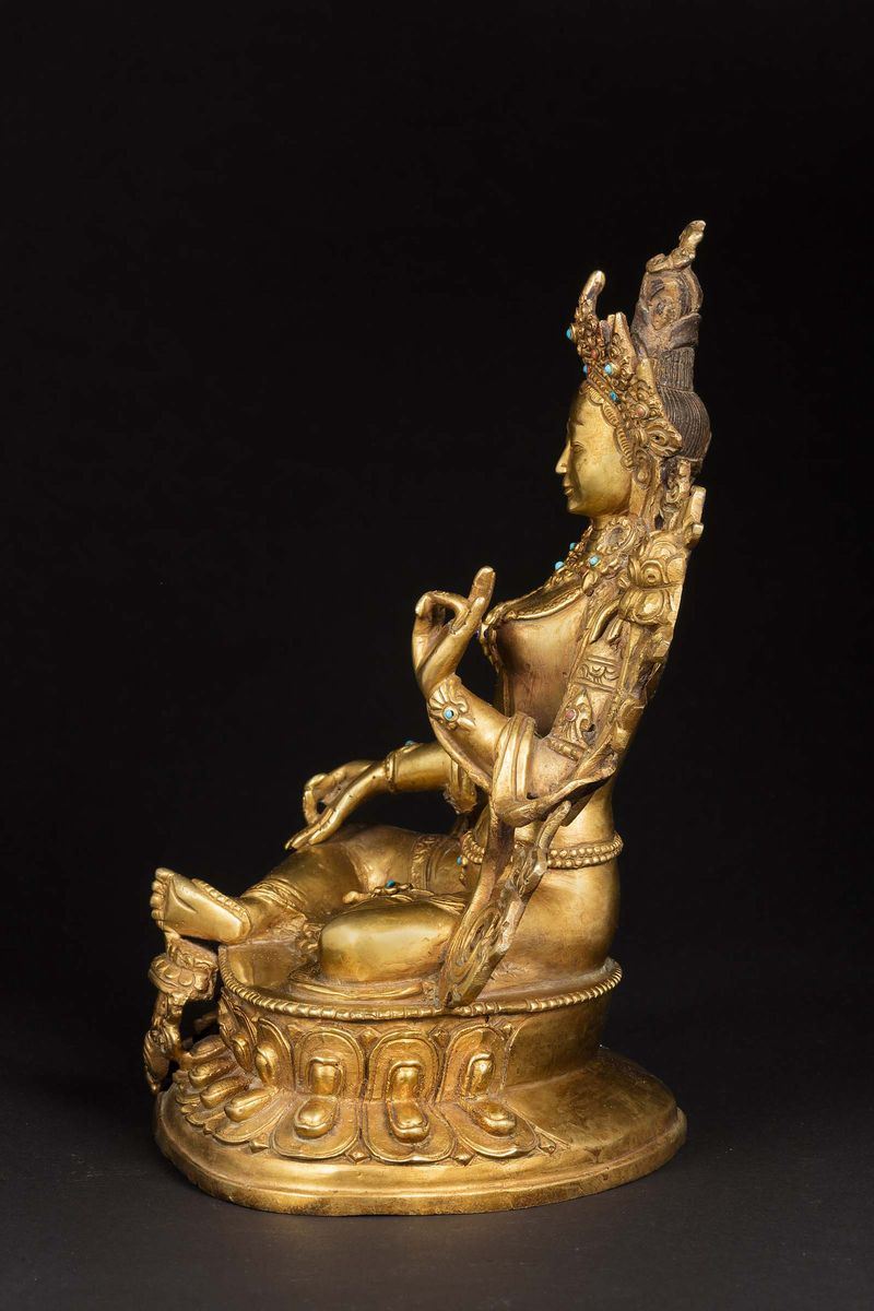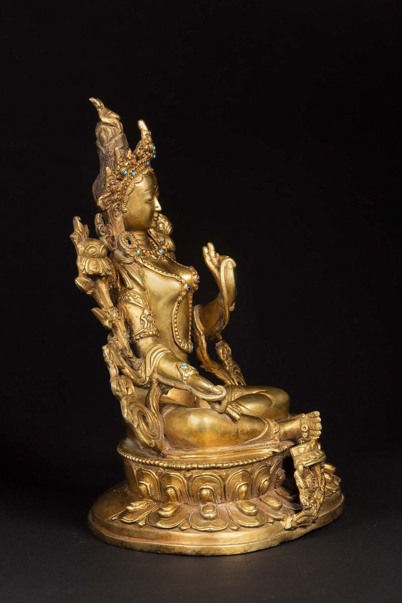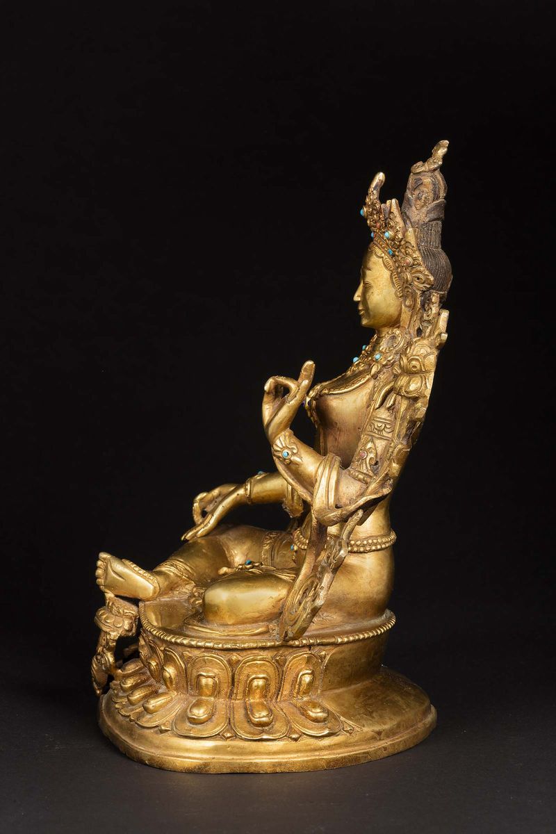 Figura di Amitaya in bronzo dorato seduta su doppio loto e applicazioni in turchese e lapislazzulo, Nepal, XX secolo