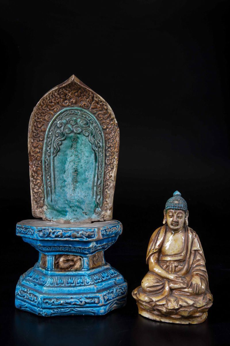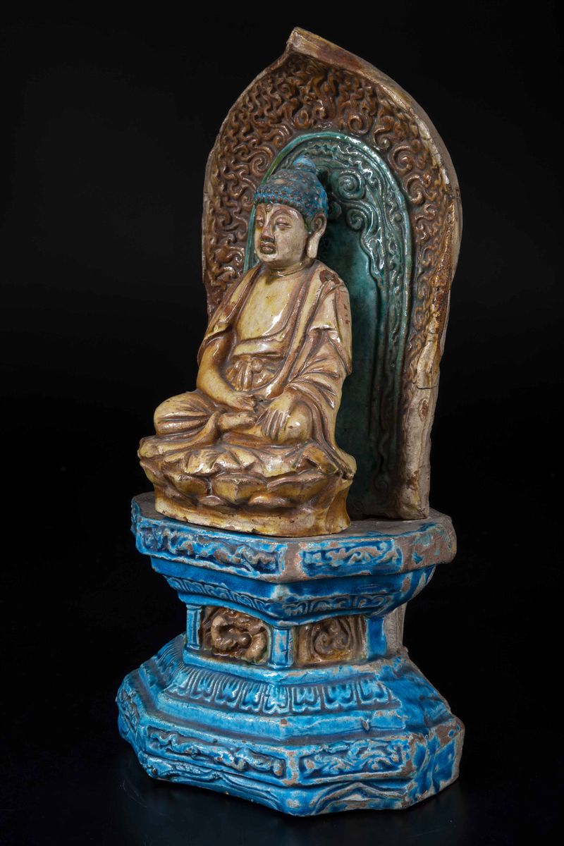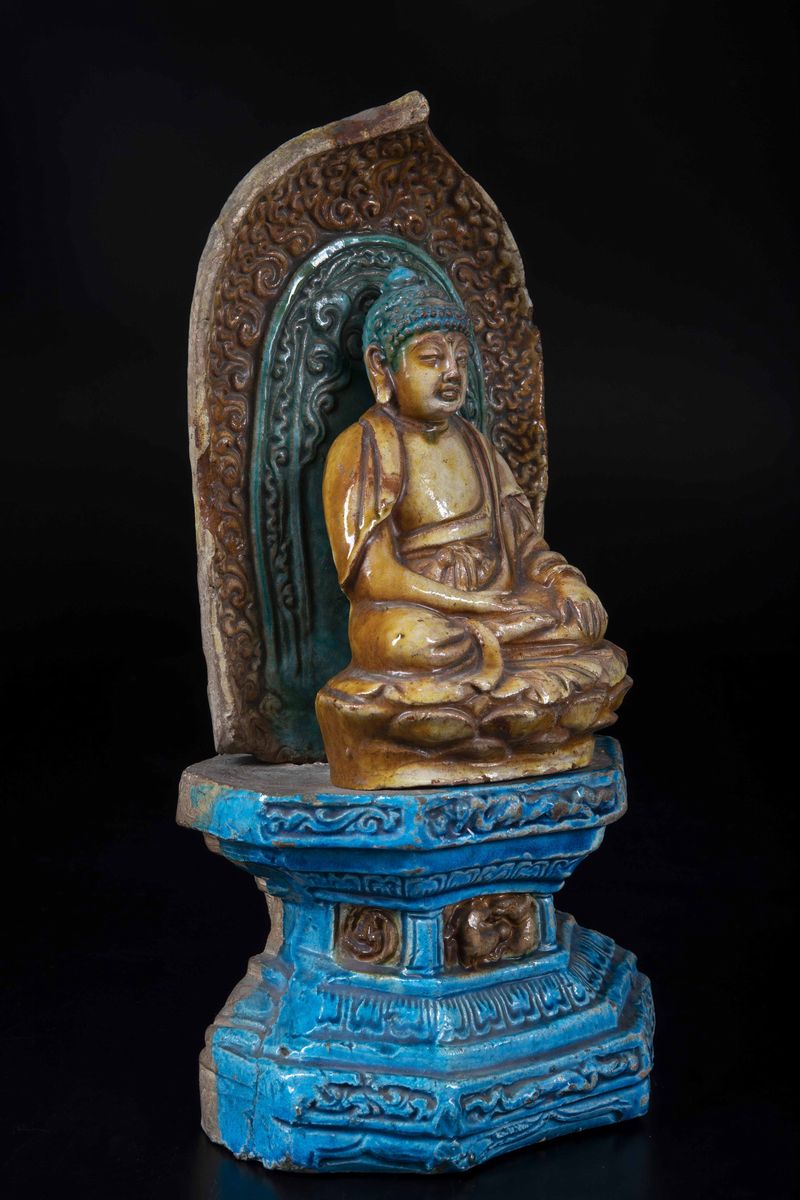 Figura di Buddha seduto entro aura in grès smaltato sui toni dell'azzurro e dell'ocra, Cina, Dinastia Qing,XIX secolo