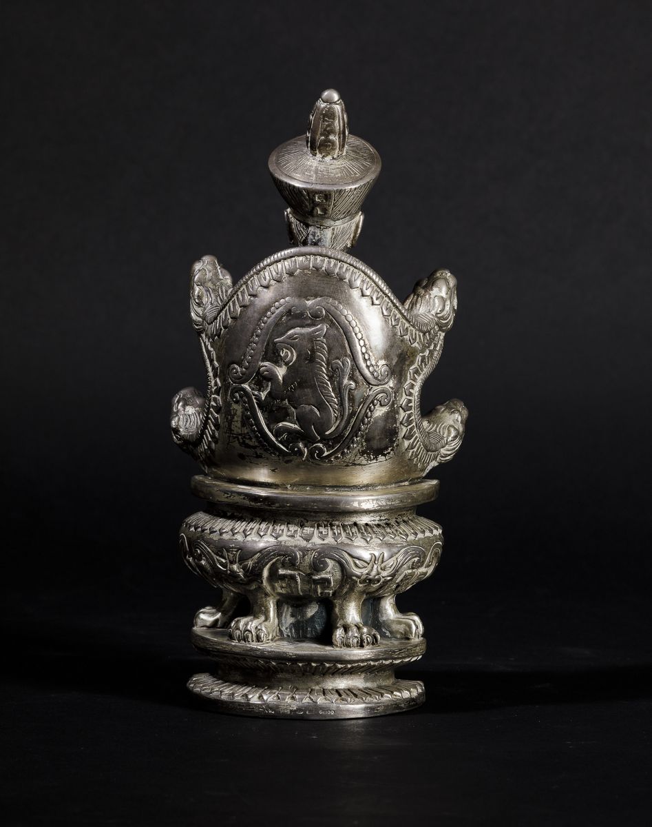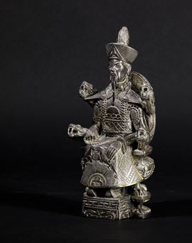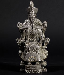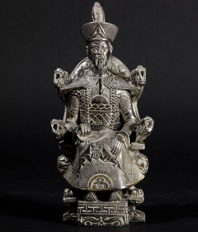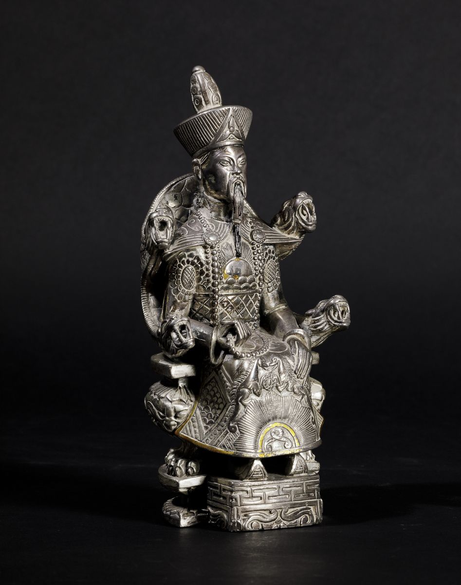 Figura di saggio seduto su trono in lamina d’argento parzialmente dorata, Cina, XX secolo