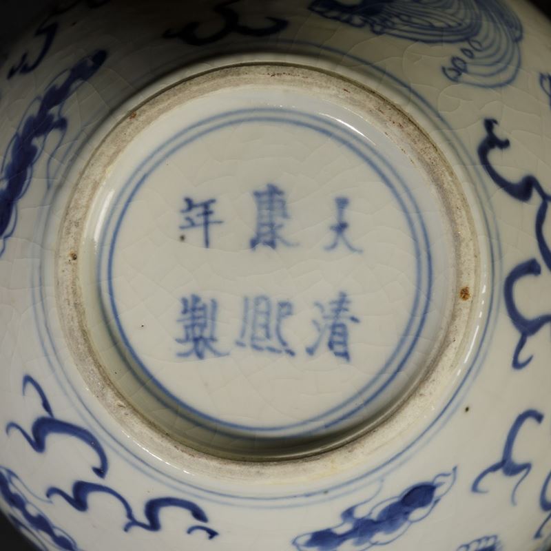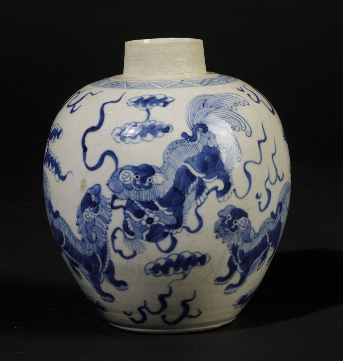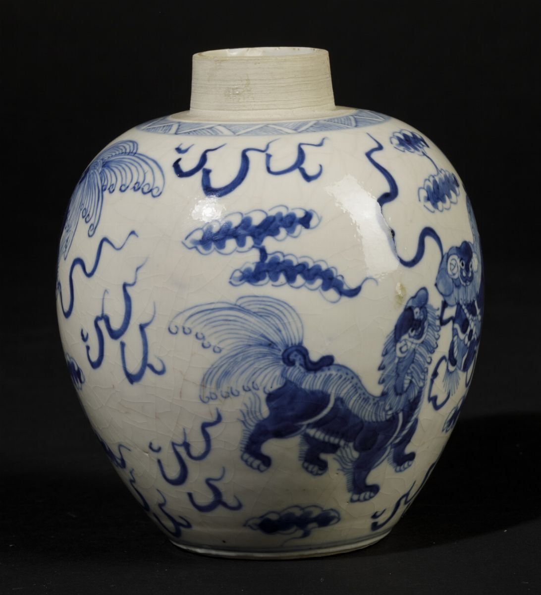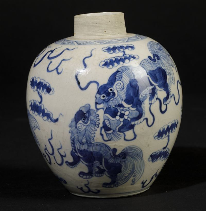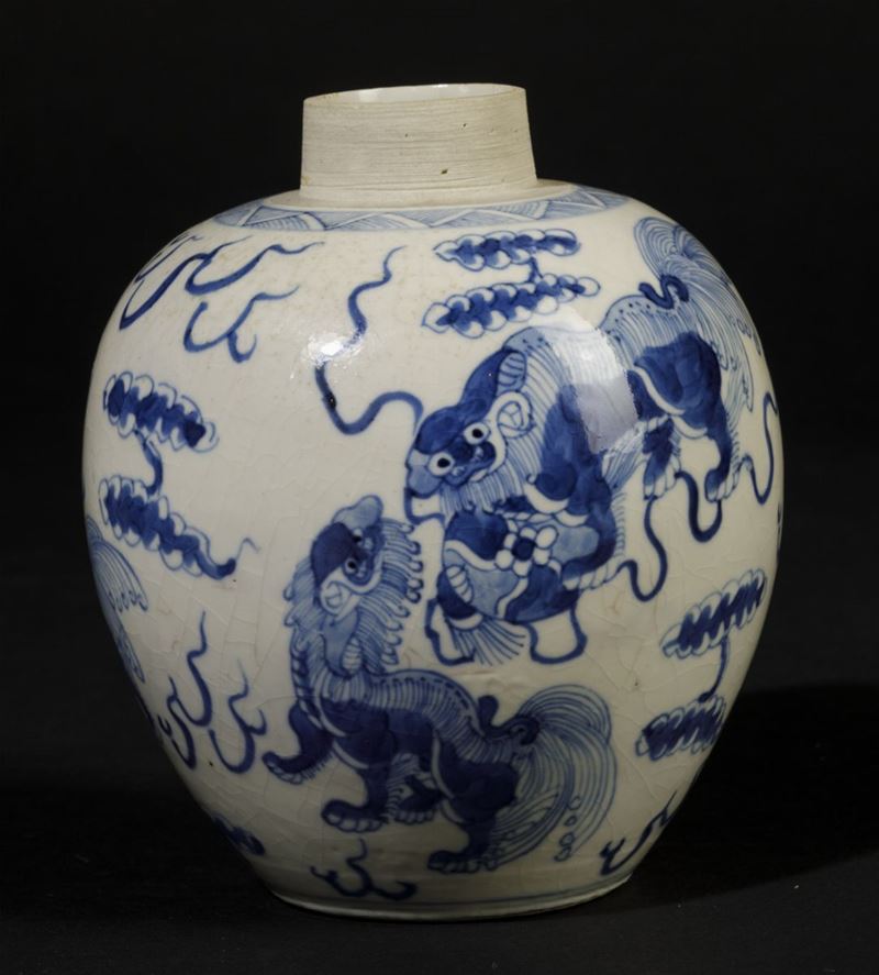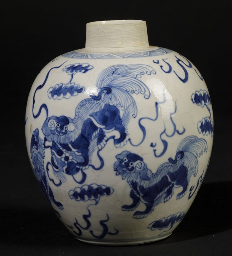 Jinger Jar in porcellana bianca e blu con cani di Pho, Cina, Dinastia Qing, epoca Kangxi (1662-1722)