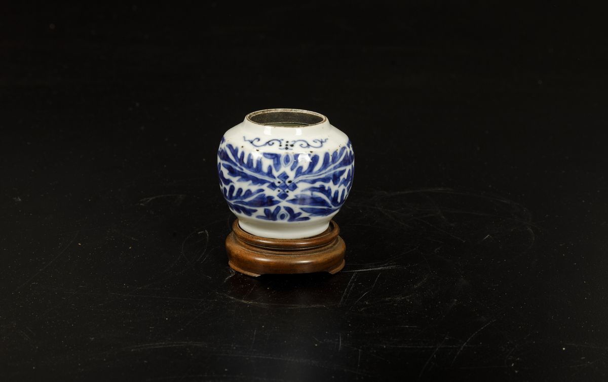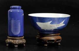 Lotto composto da ciotola con figura di pesce, vasetto cilindrico e jar senza coperchio in porcellana, Cina, Dinastia Qing, epoca Kangxi (1662-1722)