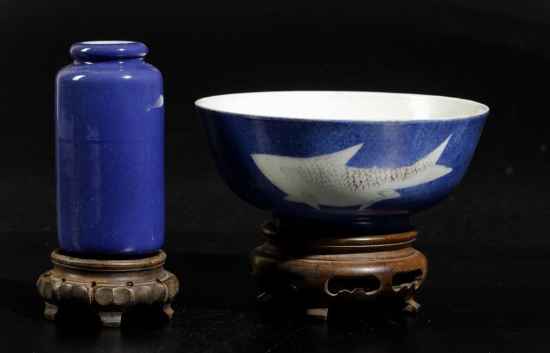 Lotto composto da ciotola con figura di pesce, vasetto cilindrico e jar senza coperchio in porcellana, Cina, Dinastia Qing, [..]