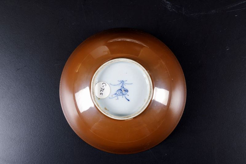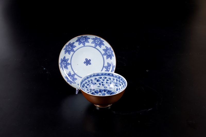 Lotto composto da coppa e piattino in porcellana bianca e blu con decori floreali, Cina, Dinastia Qing, XVII-XVIII secolo [..]