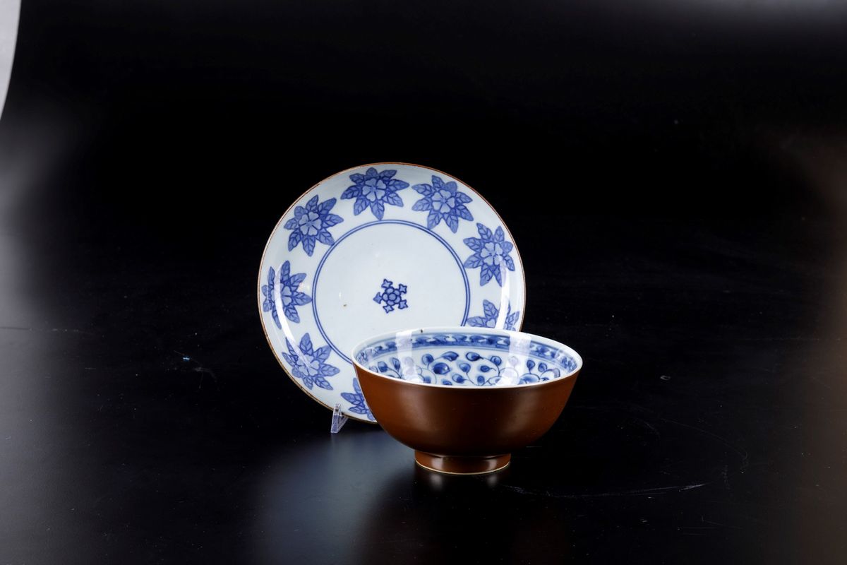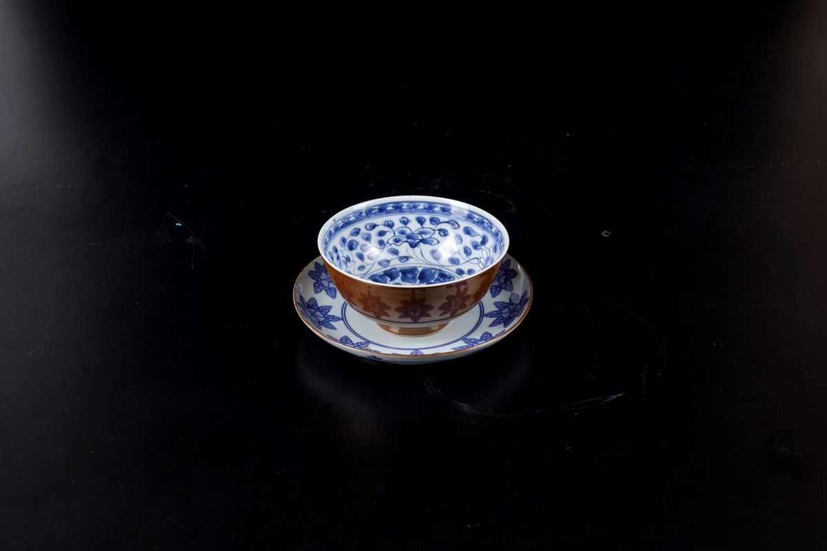 Lotto composto da coppa e piattino in porcellana bianca e blu con decori floreali, Cina, Dinastia Qing, XVII-XVIII secolo
