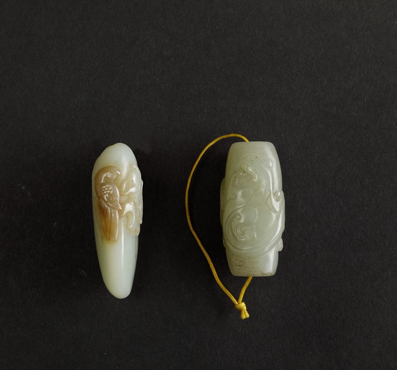 Lotto composto da due monili in giada con decori a rilievo , Cina, Dinastia Qing, XIX secolo