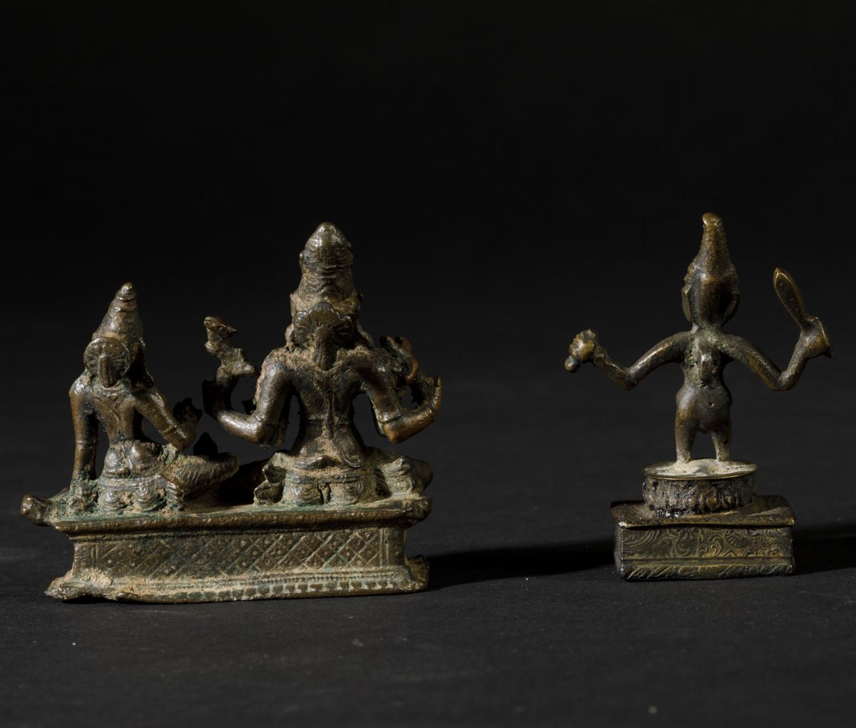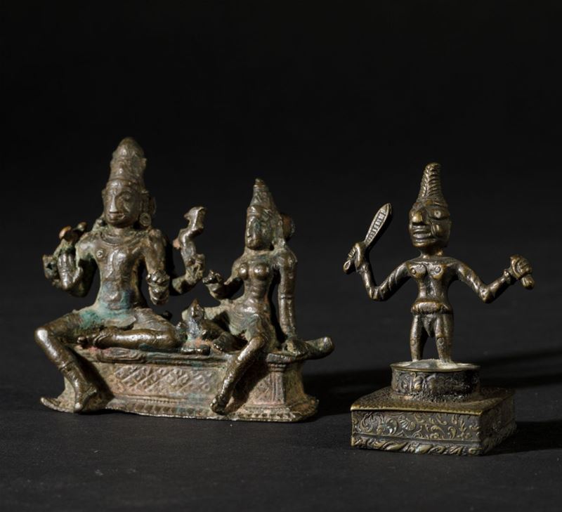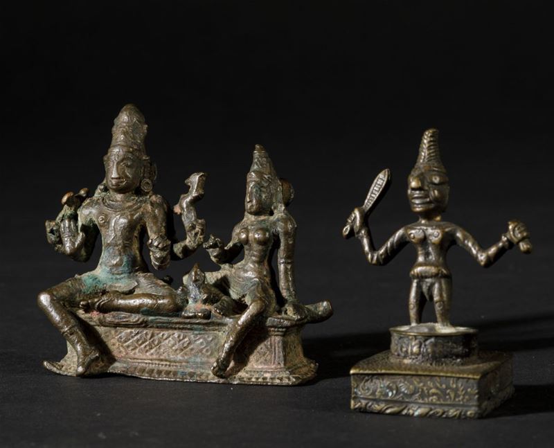 Lotto composto da due sculture in bronzo raffiguranti divinità e guerriero, India, XVII secolo
