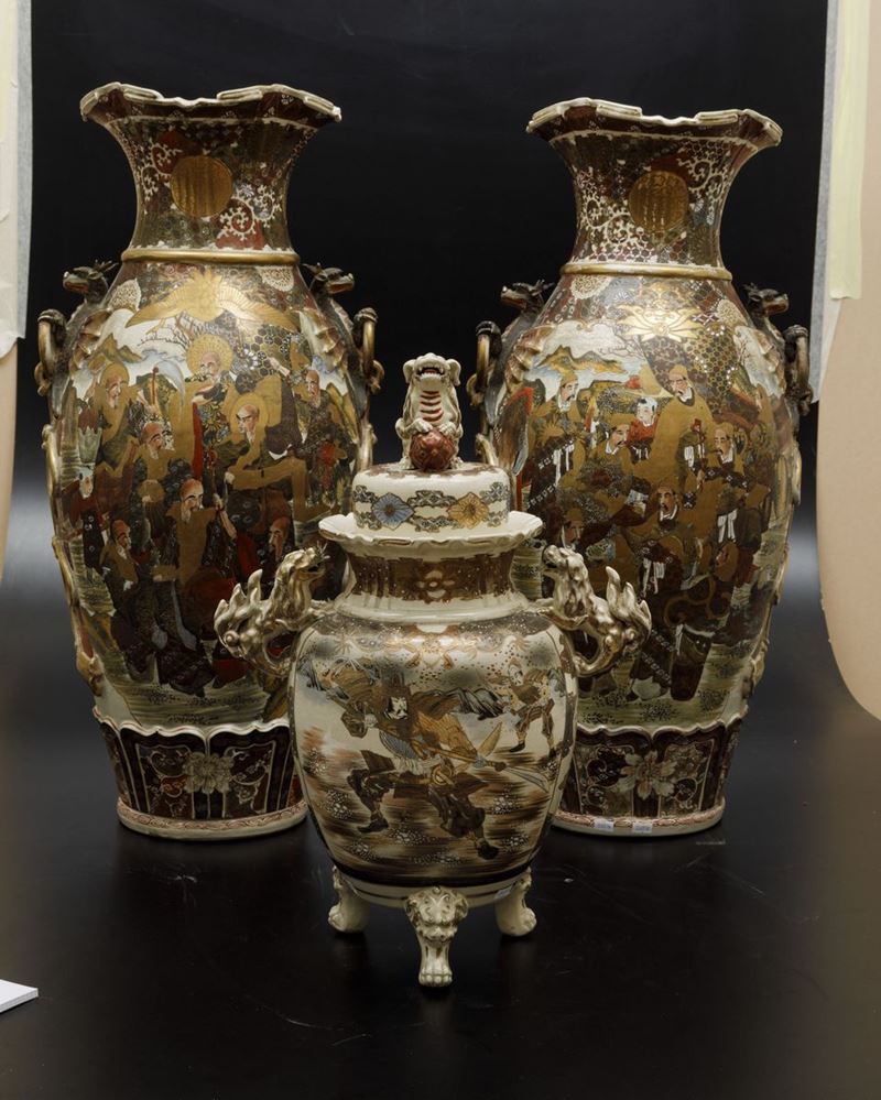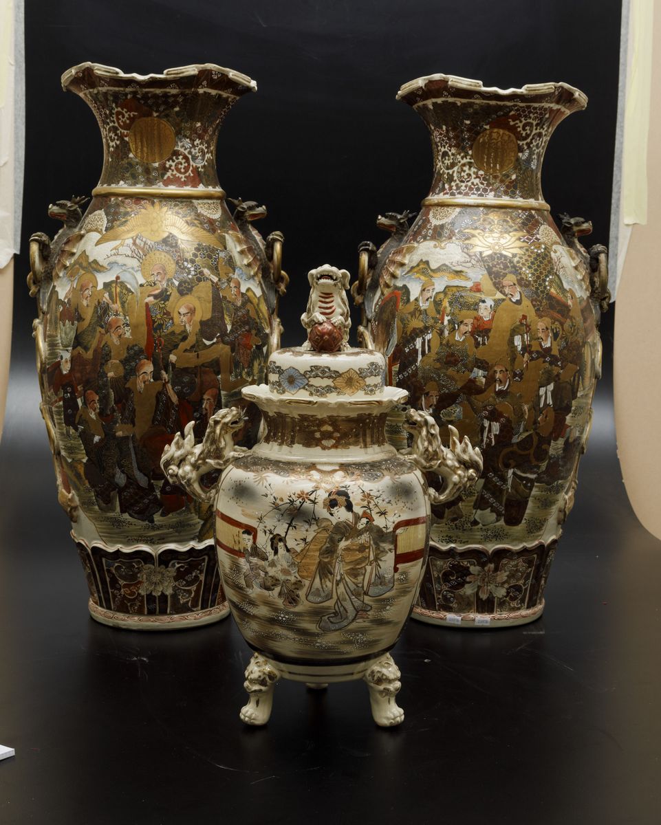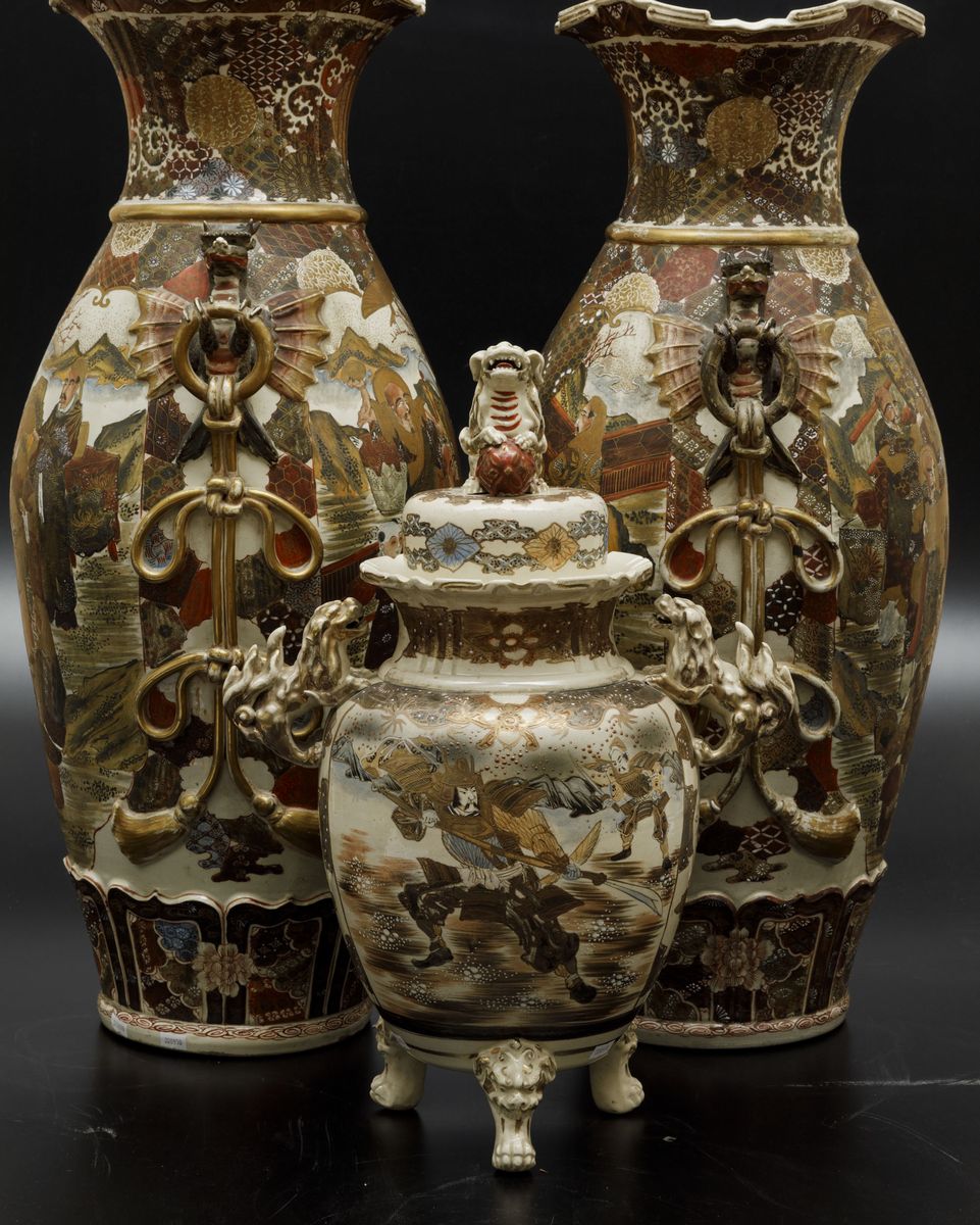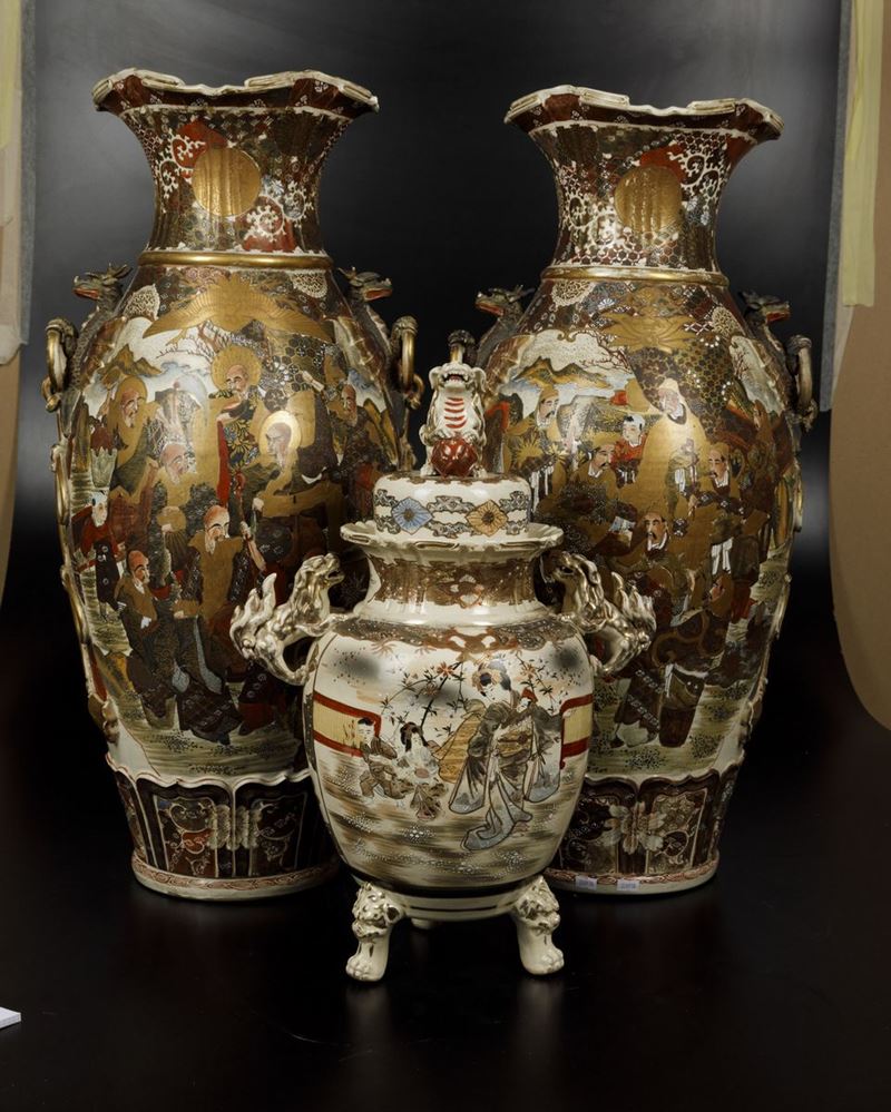 Lotto composto da due vasi e da un incensiere in porcellana Satsuma, Giappone, periodo Meiji (1868-1912)