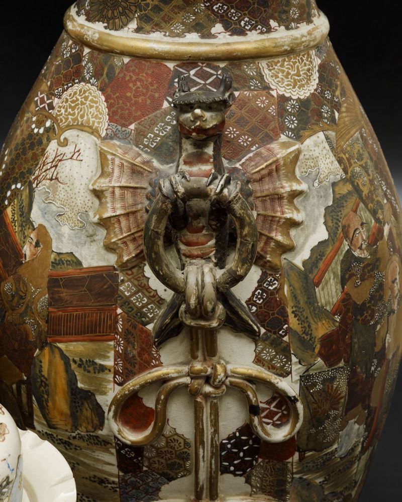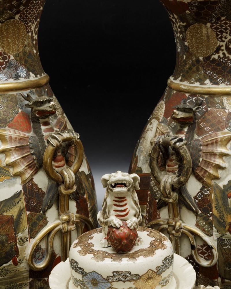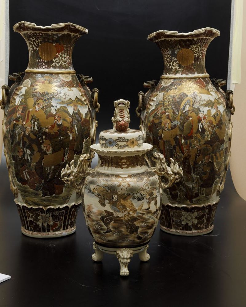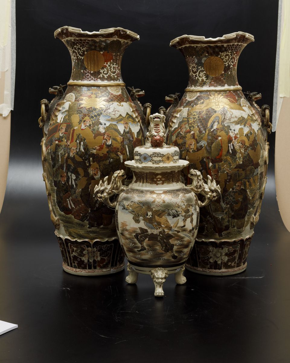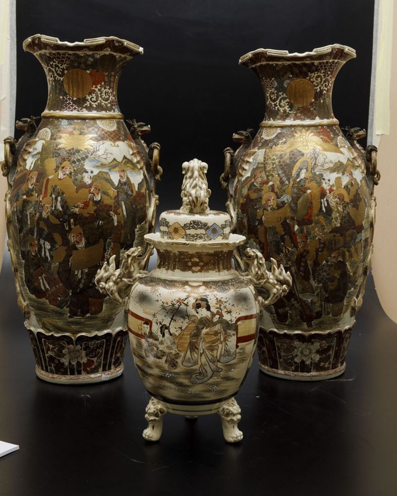 Lotto composto da due vasi e da un incensiere in porcellana Satsuma, Giappone, periodo Meiji (1868-1912)